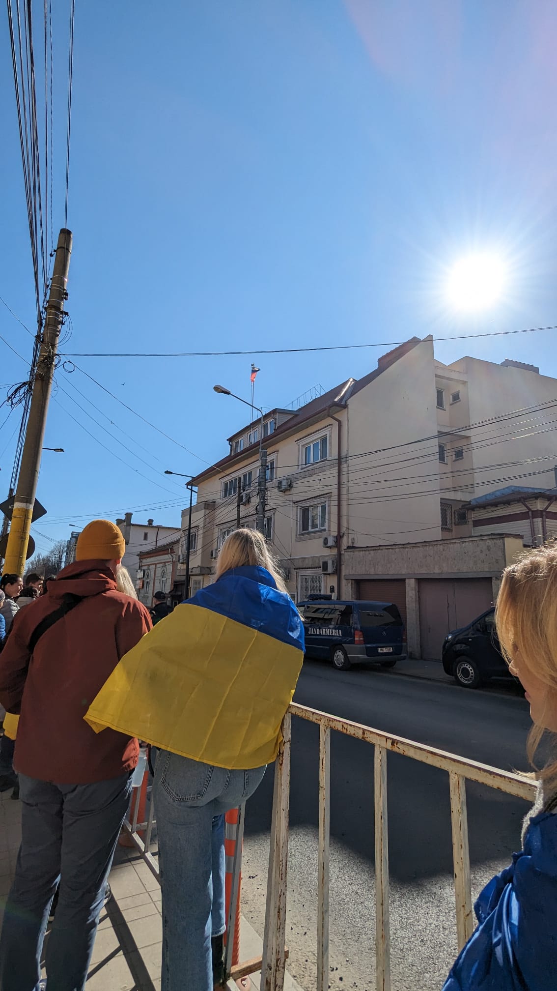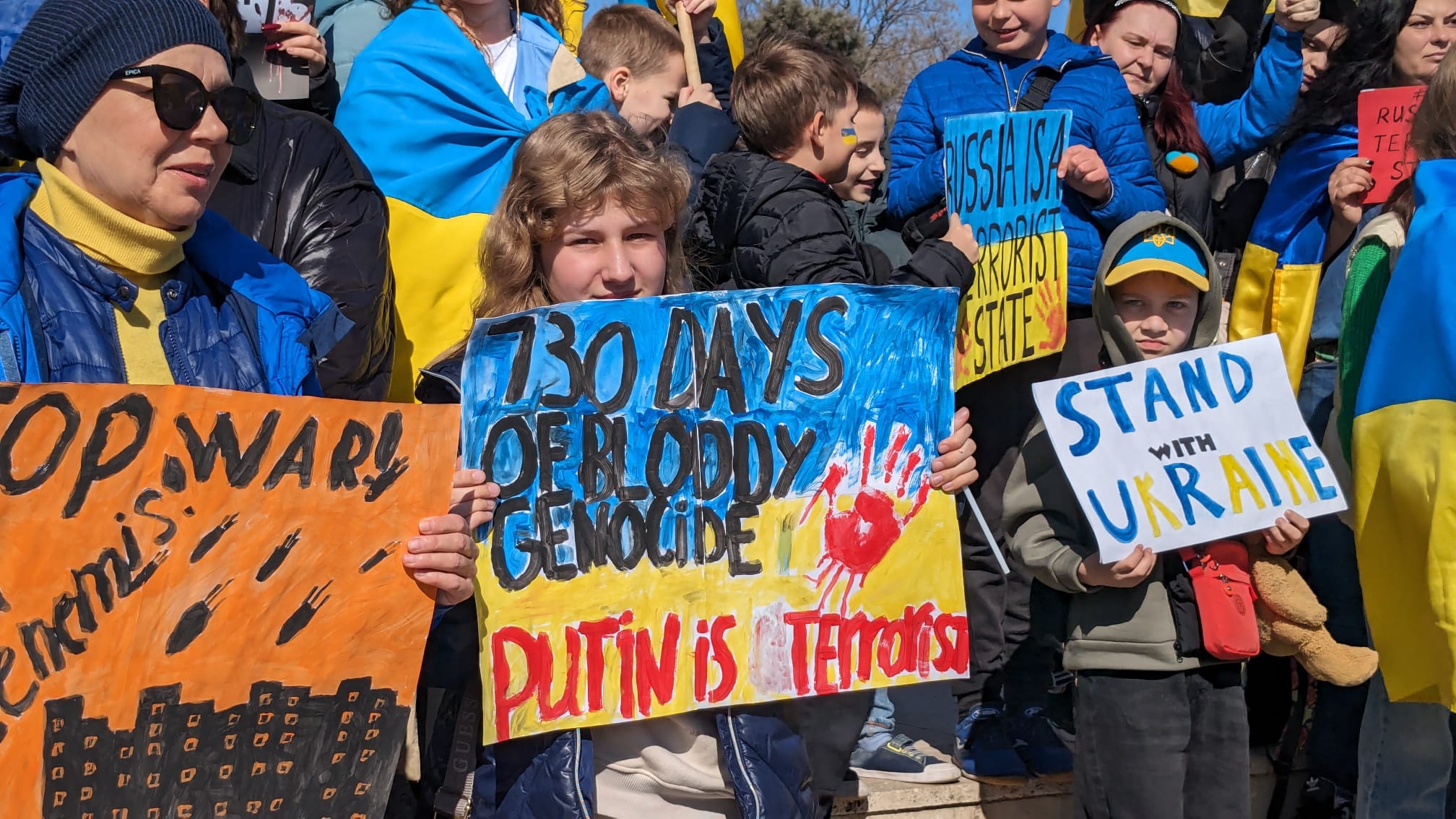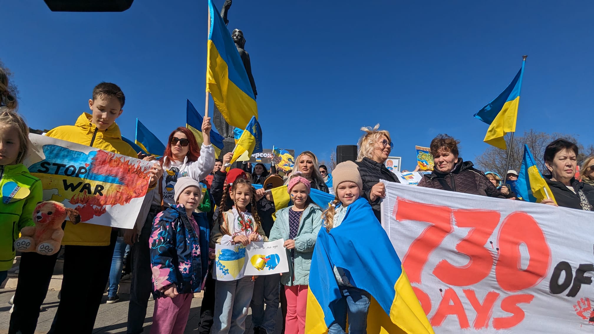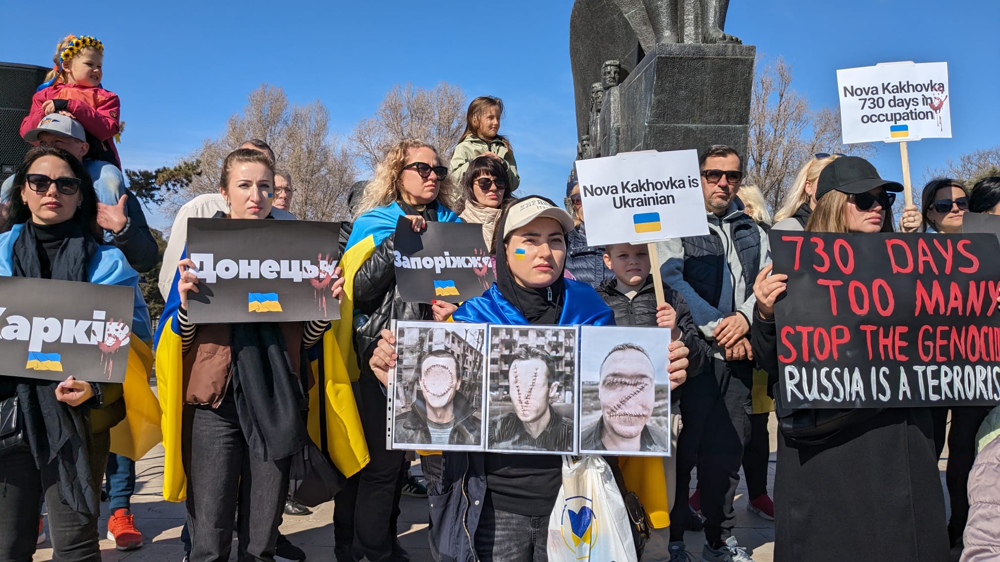 Ne-am adunat pentru a reaminti lumii de cei doi ani sângeroși de genocid al poporului ucrainean. Deja de doi ani Rusia comite crime împotriva populației civile, violează femei și copii, ucide oameni nevinovați, în fiecare zi pe front mor apărătorii noștri, printre ei mulți tineri băieți și fete care ar trebui să aibă toată viața înainte… Ucrainenii apără acum nu doar patria lor, ci și întreaga Europă. Imaginați-vă, războiul este doar la 150 de km de locul în care ne aflăm acum… Dacă nu oprim acum agresorul, rușii vor ocupa Ucraina, vor veni cu războiul în Moldova, țările baltice, alte țări vecine ale Uniunii Europene. Militarilor noștri le este necesar armament! Suntem recunoscători României pentru primirea călduroasă, pentru ajutorul acordat militarilor noștri, pentru ajutorul acordat refugiaților noștri, dar… toți vrem să ne întoarcem acasă!, este mesajul Irynei, participantă la miting. Orașul ei natal, Oleshky (regiunea Herson), a fost ocupat de la începutul invaziei și acum este inundat în proporție de 80% din cauza distrugerii Hidrocentralei Kahovka, iar tatăl ei este prizonier de mai mult de un an și jumătate.