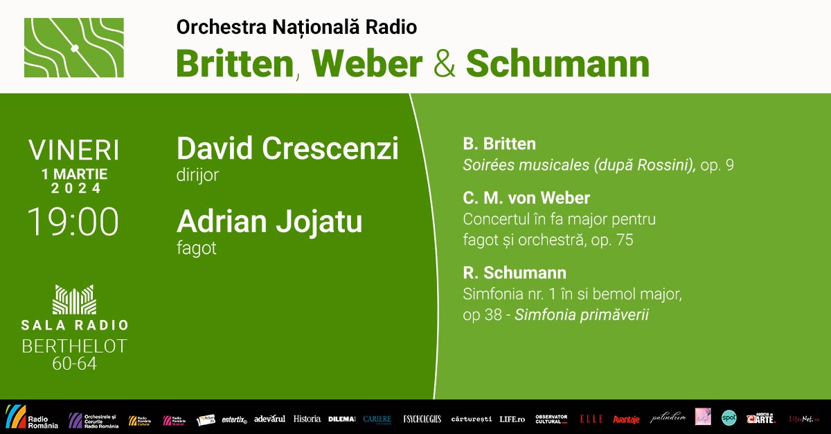 Sub conducerea muzicală a dirijorului italian David Crescenzi, veți asculta la Sala Radio și Soirées musicales (după Rossini), lucrare semnată de Benjamin Britten, dar și Concertul pentru fagot și orchestră creat de compozitorul german Carl Maria Von Weber. Această lucrare reprezintă și un prilej de a-l aplauda, ca solist, pe fagotistul Adrian Jojatu. Artistul român și-a definitivat studiile muzicale în Statele Unite, la Boston University, și din anul 2012 este invitat deseori, ca prim-fagotist, alături de orchestrele Boston Pops și Boston Philharmonic, colaborând deseori și cu Boston Symphony.