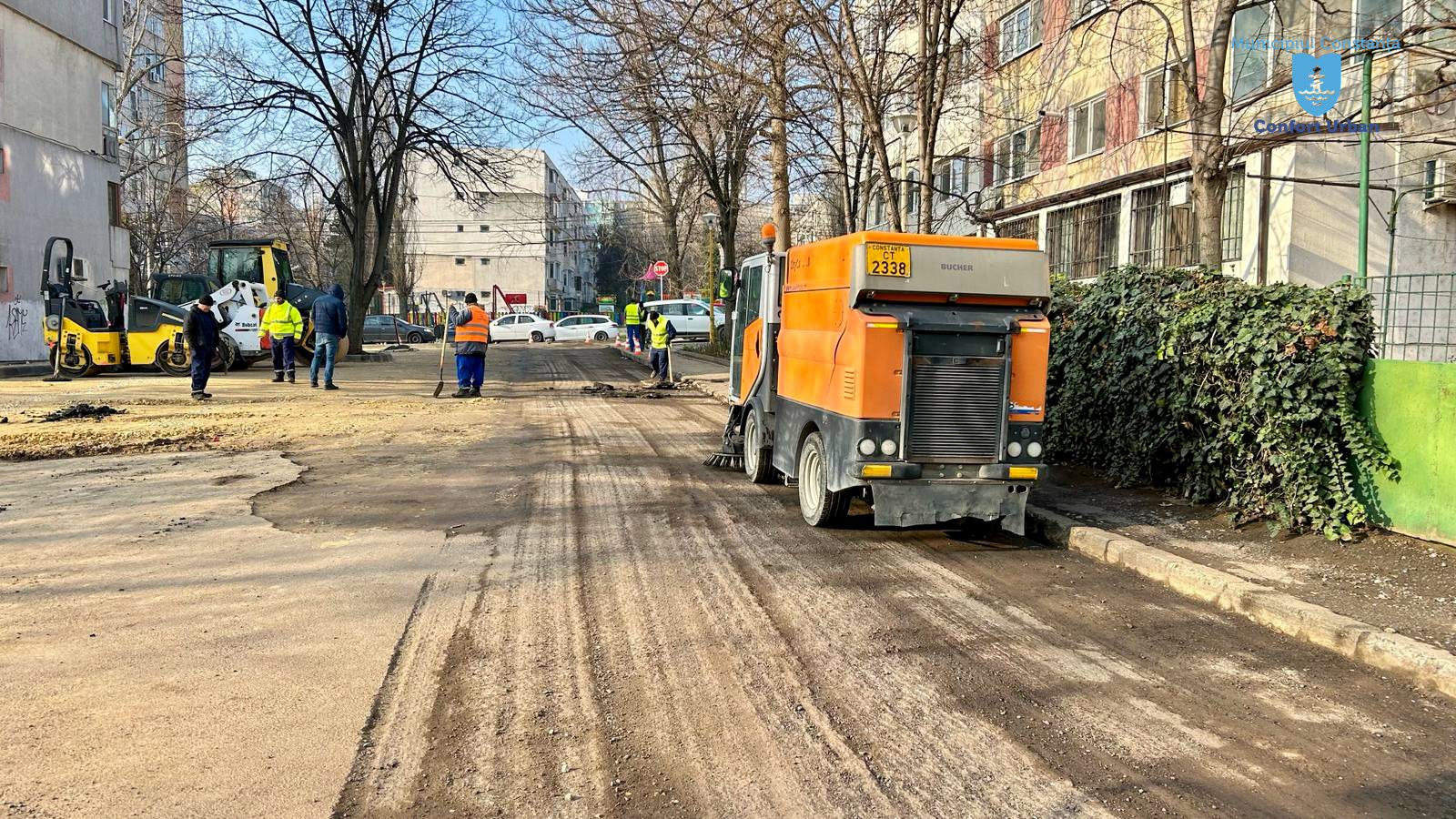 În paralel, se recondiționează și infrastructura pietonală. Se asfaltează trotuarele după ce au fost înlocuite vechile borduri deteriorate. Ulterior, se vor aplica marcajele rutiere.