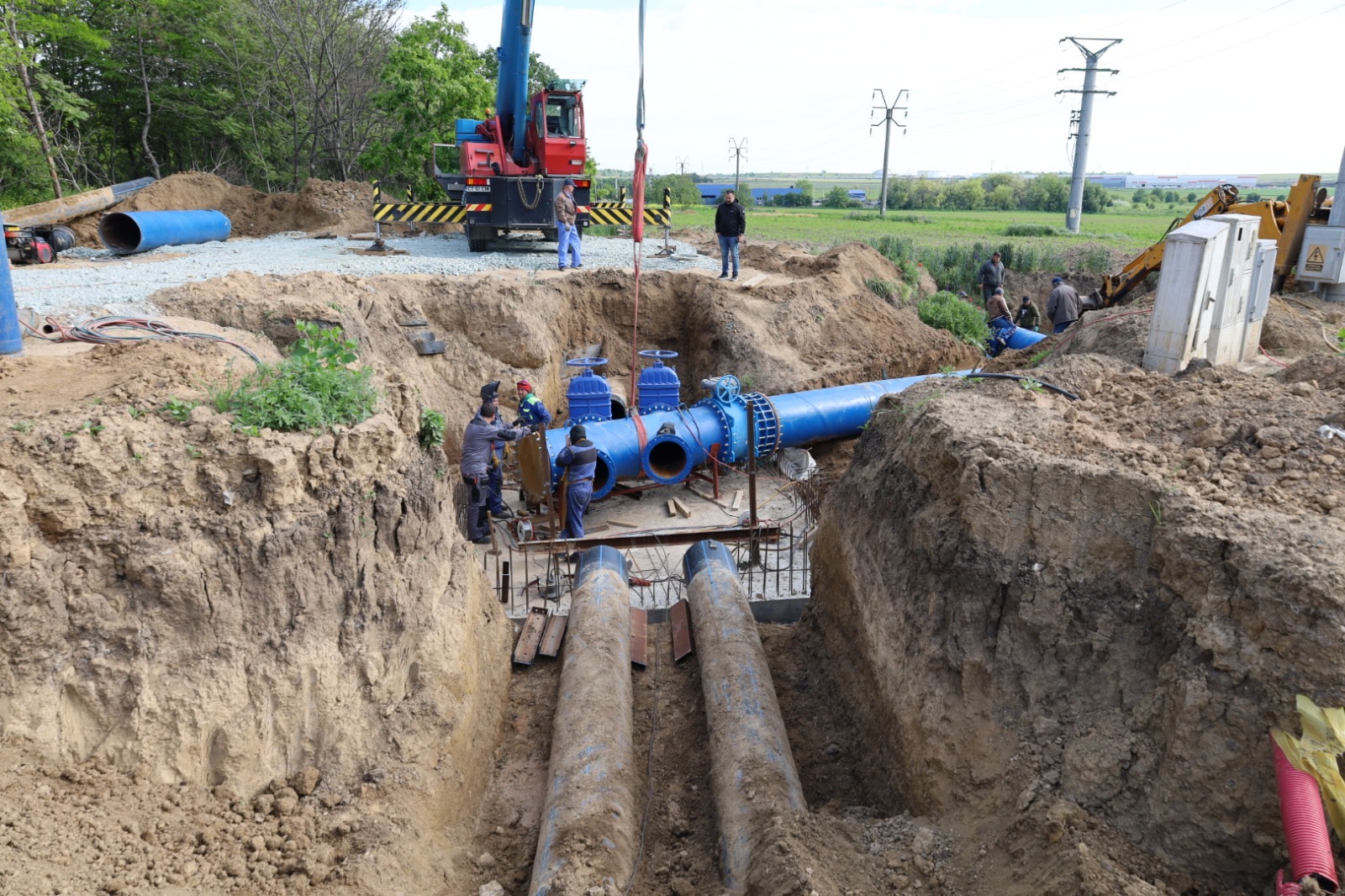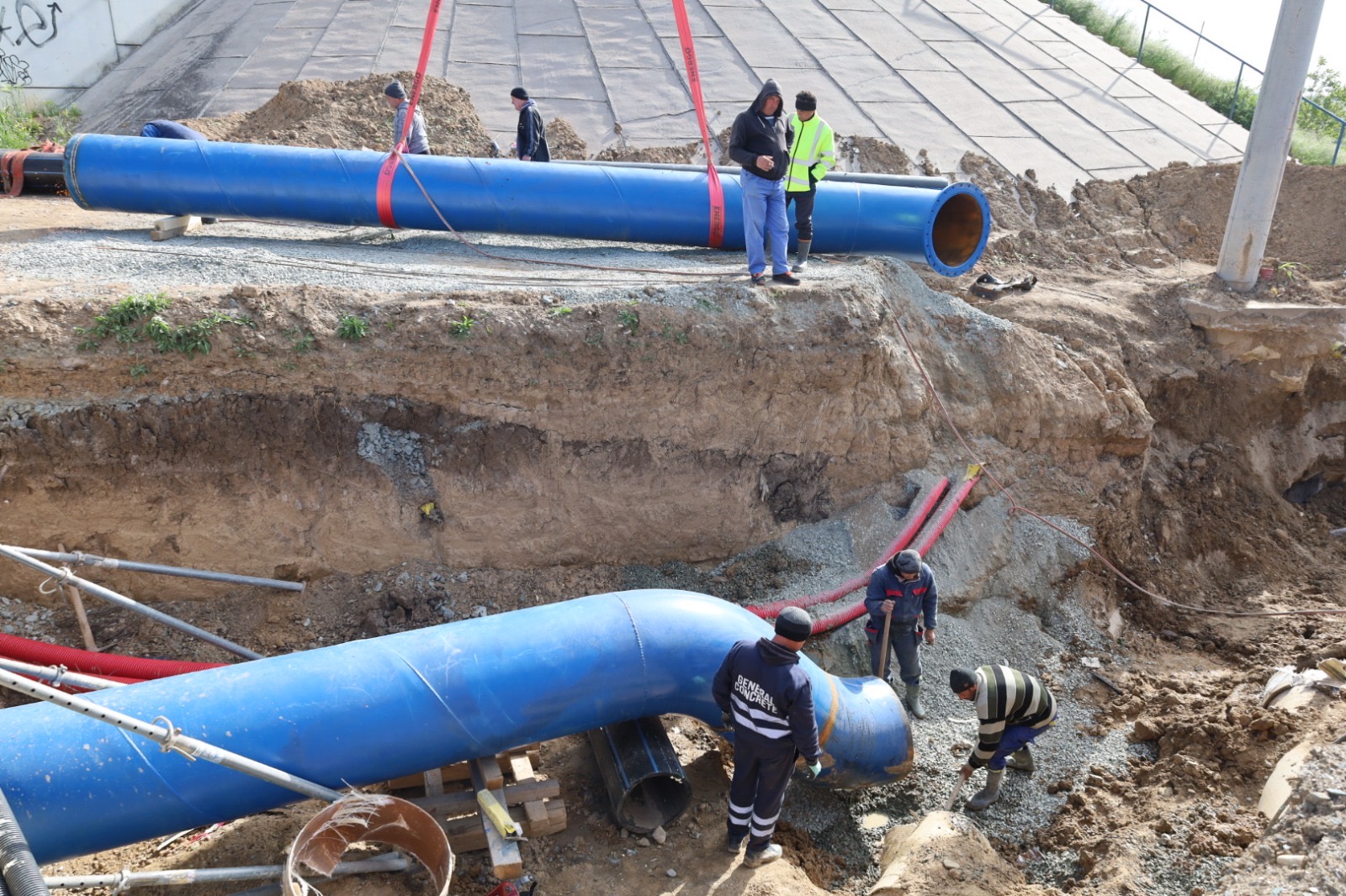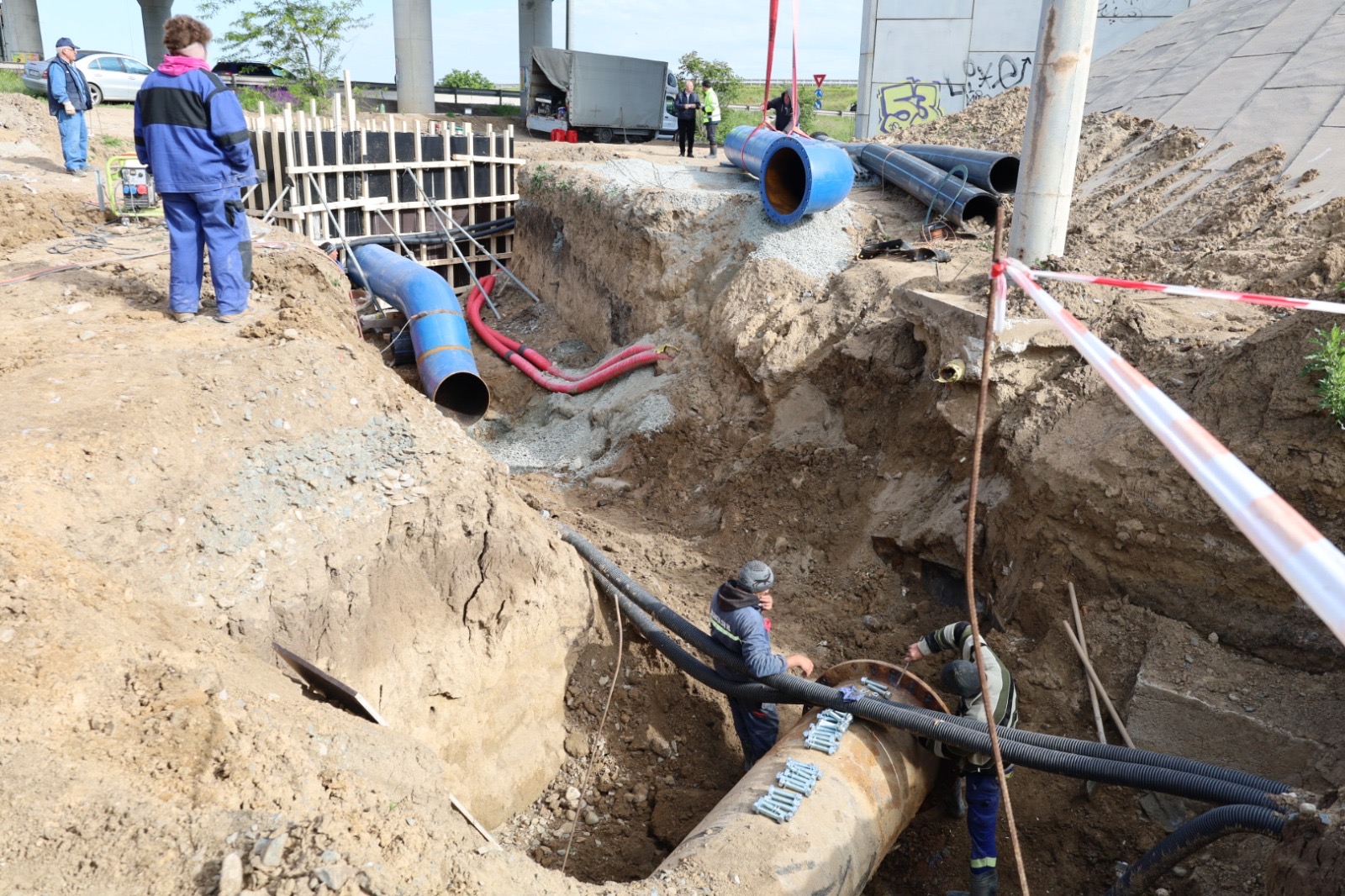 Lucrările executate pentru conectarea conductei de aducțiune, cu diametrul de 1.000 mm, sunt mult îngreunate deoarece golirea magistralei s-a realizat foarte greu, având în vedere diametrul, dar și lungimea acesteia. Și la ora actuală, echipele aflate pe teren intervin pe conducta pe care curge încă apă și montează o vană pentru sectorizarea rețelei, dar și pentru oprirea apei pentru a se putea realiza operațiunile de sudură. Deși intervențiile sunt dificile din cauza cantității mari de apă, lucrările se află în grafic. La nivelul punctelor de lucru, deschise pentru conectarea noului tronson la rețeaua de distribuție, 6 echipe de intervenție și 7 utilaje lucrează de noaptea trecută, în regim continuu. În prezent, o parte din echipe lucrează la blindarea vechii conducte, în timp ce, cu ajutorul utilajelor, se pune pe poziție noul tronson de legătură. Urmează să se realizeze sudura de cuplare a noii rețele la conducta existentă. Magistrala înlocuită are o vechime de zeci de ani și a înregistrat numeroase avarii ce au dus la sistarea furnizării de apă către abonații deserviți. Mai mult, având în vederea degradarea tronsoanelor, dar și creșterea debitului de apă în timpul sezonului estival, exista riscul unei avarii majore, ce ar fi dus la oprirea furnizării de apă pe o perioadă extinsă de timp.