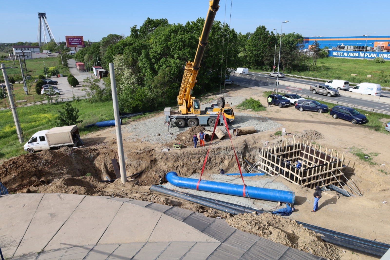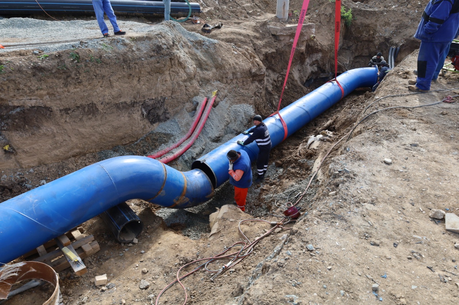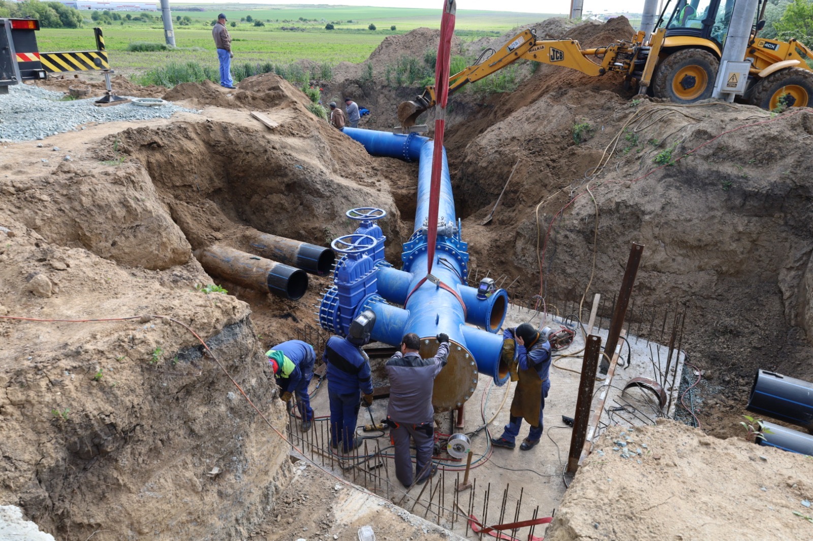 Lucrările executate pentru conectarea conductei de aducțiune, cu diametrul de 1.000 mm, sunt mult îngreunate deoarece golirea magistralei s-a realizat foarte greu, având în vedere diametrul, dar și lungimea acesteia. Și la ora actuală, echipele aflate pe teren intervin pe conducta pe care curge încă apă și montează o vană pentru sectorizarea rețelei, dar și pentru oprirea apei pentru a se putea realiza operațiunile de sudură. Deși intervențiile sunt dificile din cauza cantității mari de apă, lucrările se află în grafic. La nivelul punctelor de lucru, deschise pentru conectarea noului tronson la rețeaua de distribuție, 6 echipe de intervenție și 7 utilaje lucrează de noaptea trecută, în regim continuu. În prezent, o parte din echipe lucrează la blindarea vechii conducte, în timp ce, cu ajutorul utilajelor, se pune pe poziție noul tronson de legătură. Urmează să se realizeze sudura de cuplare a noii rețele la conducta existentă. Magistrala înlocuită are o vechime de zeci de ani și a înregistrat numeroase avarii ce au dus la sistarea furnizării de apă către abonații deserviți. Mai mult, având în vederea degradarea tronsoanelor, dar și creșterea debitului de apă în timpul sezonului estival, exista riscul unei avarii majore, ce ar fi dus la oprirea furnizării de apă pe o perioadă extinsă de timp.