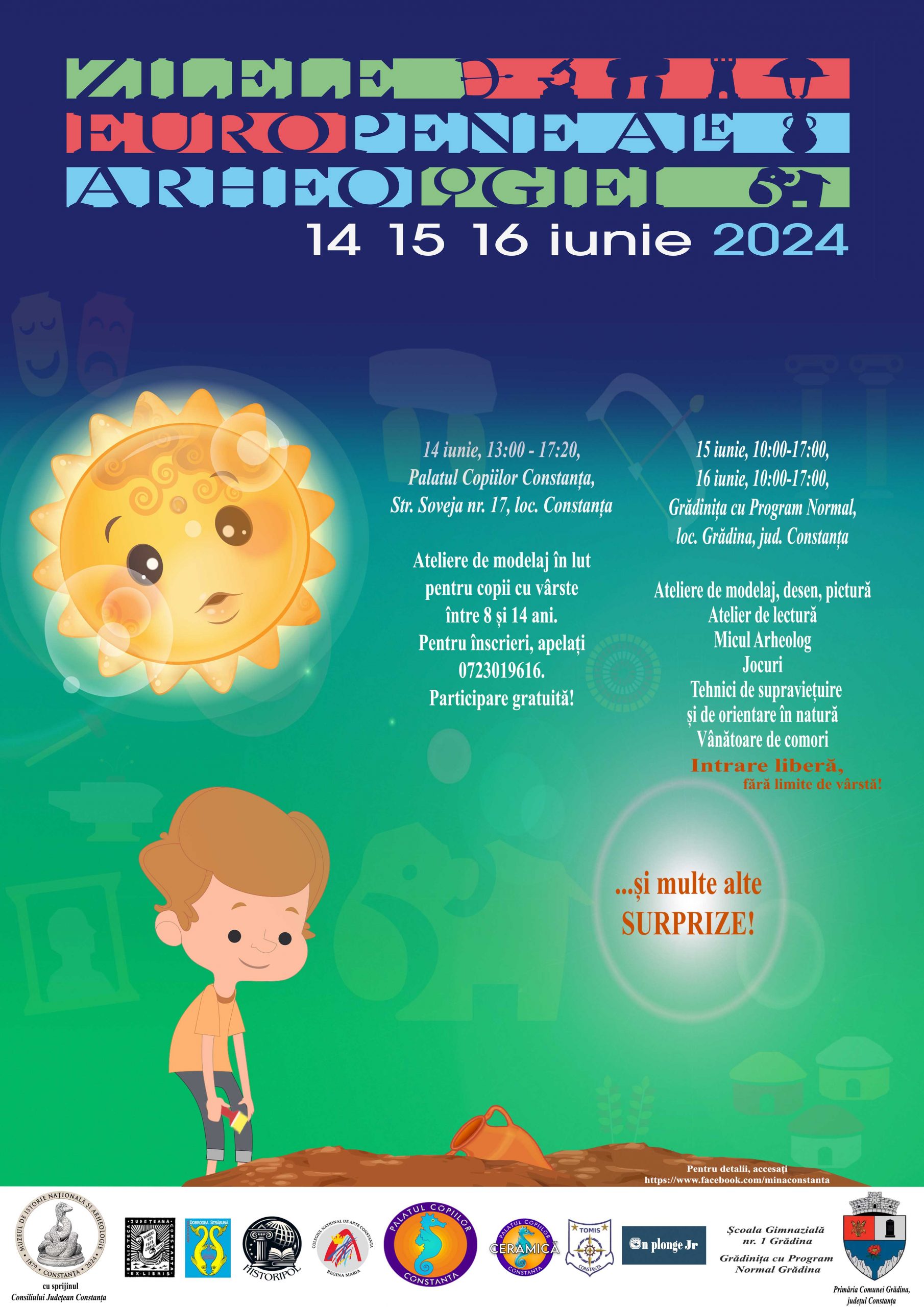Startul activităților distractive va fi dat vineri, 14 iunie, la Palatul Copiilor Constanța din Strada Soveja nr. 17, unde, în intervalul orar 13:00-17:20, copiii cu vârste între 8 și 14 ani sunt invitați să participe la trei ateliere de modelaj figurativ și zoomorf cu decor neolitic și antic. Atenție! În această zi, locurile sunt limitate! Cei interesați să participe sunt rugați să apeleze numărul de telefon 0723019616 pentru înscriere.