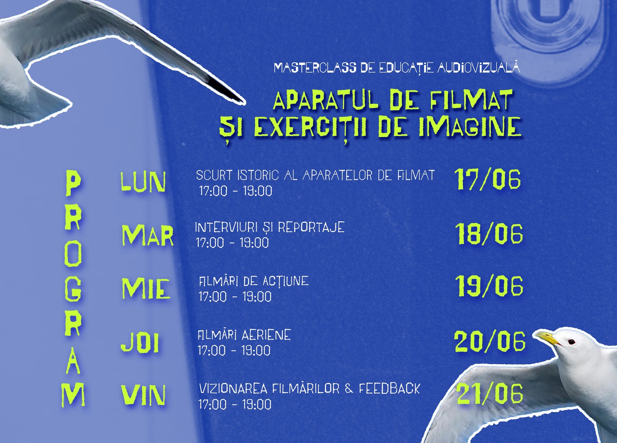 În perioada 17-21 iunie, de la ora 17.00, tinerii selectaţi în urma completării unui chestionar se vor întâlni în Tabăra Sulina cu Alecu Vitzentzatos, cel care va susţine un masterclass de educaţie audiovizuală, intitulat Aparatul de filmat şi exerciţii de imagine. Participarea este gratuită, iar acţiunea se adresează celor cu vârste cuprinse între 14 şi 20 de ani.