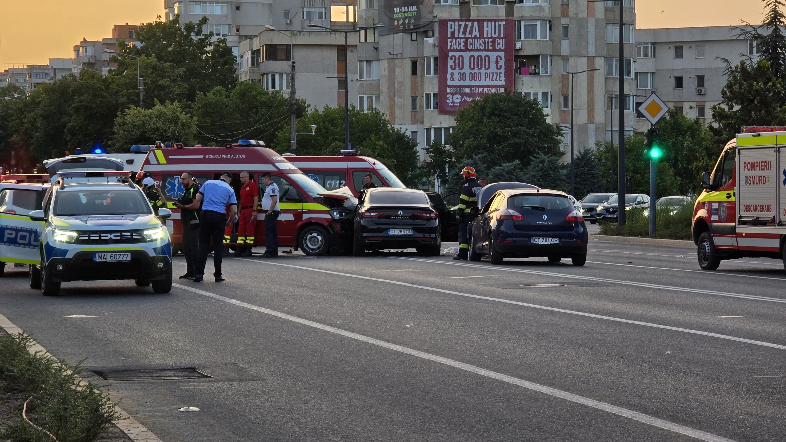 Pompierii din cadrul ISU Dobrogea au fost solicitați să intervină în această seara la un accident rutier produs în Constanța, la intersecția bulevardelor Alexandru Lăpușneanu și Tomis.