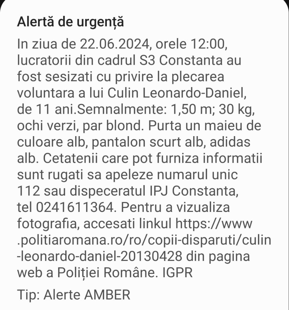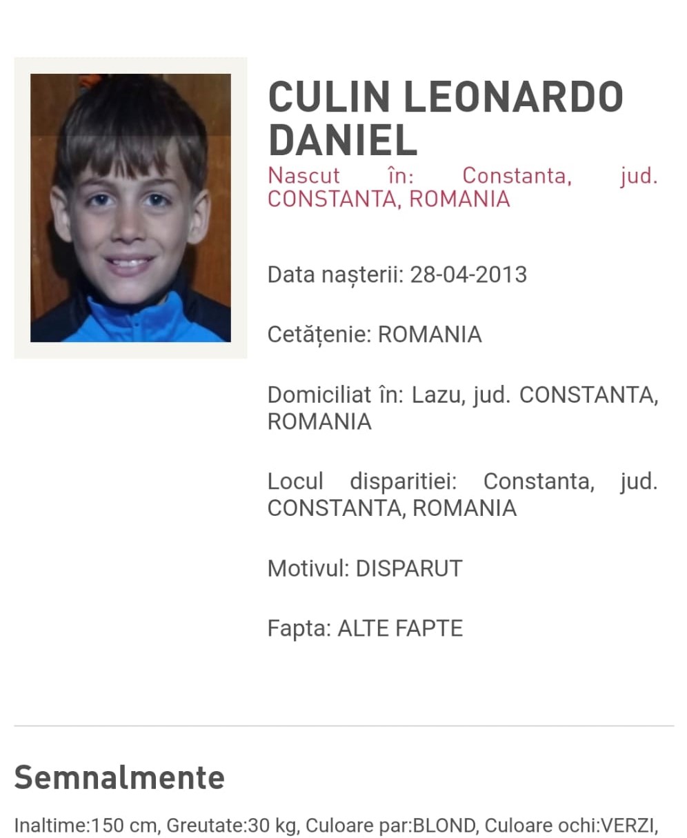 La data de 23 iunie a.c., în jurul orei 18.00, polițiști din cadrul Poliției Municipiului Constanța – Secția 3 Poliție au fost sesizați cu privire la plecarea voluntară a minorului CULIN LEONARDO DANIEL, de 11 ani, din municipiul Constanța, județul Constanța.