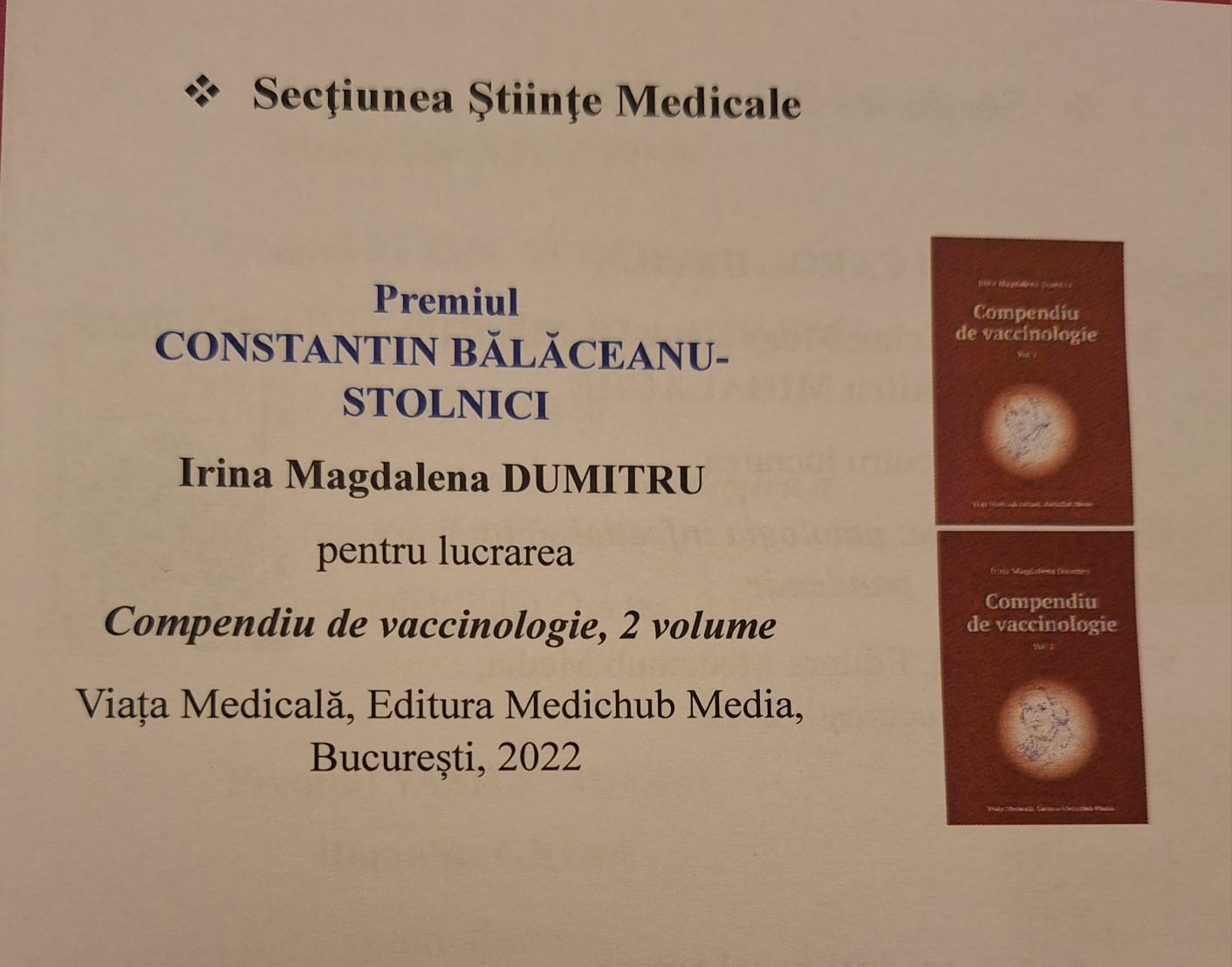 Dr. Irina Dumitru, medic primar boli infecțioase și epidemiologie la Spitalul de Boli Infecțioase Constanța, a primit, alături de prof. univ. dr. Sorin Rugină, premiul “Carol Davila” pentru lucrarea Patologia infecțioasă în pandemie, și premiul “Constantin Bălăceanu Stolnici” pentru Compendiu de vaccinologie.
