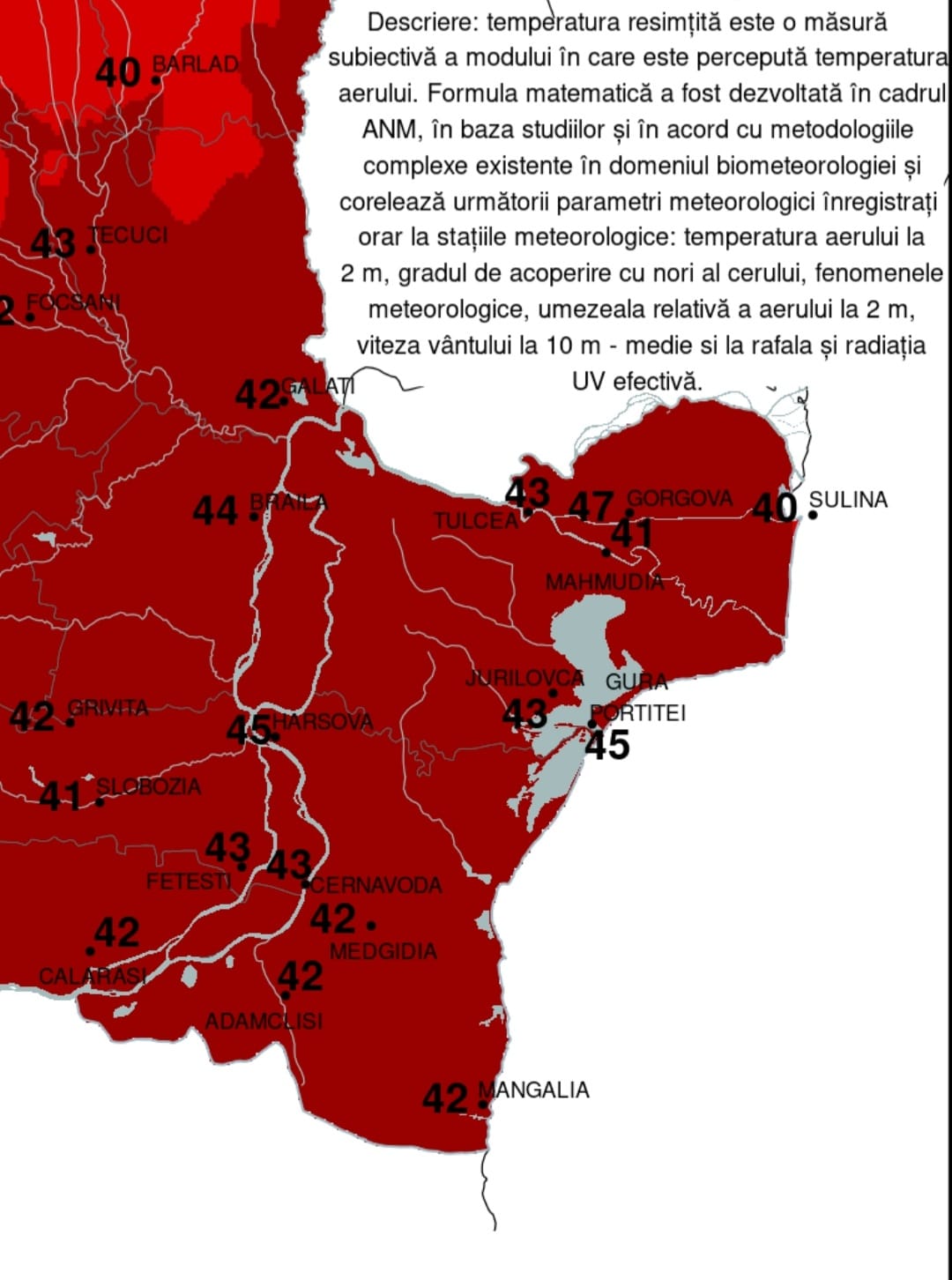 Avem parte și astăzi de încă o zi cu temperaturi caniculare în Dobrogea, inclusiv pe litoral. Maximele termice se vor situa între 37 și 41 de grade la umbră, în partea continentală a regiunii, iar în zona de litoral vor atinge 36 de grade.