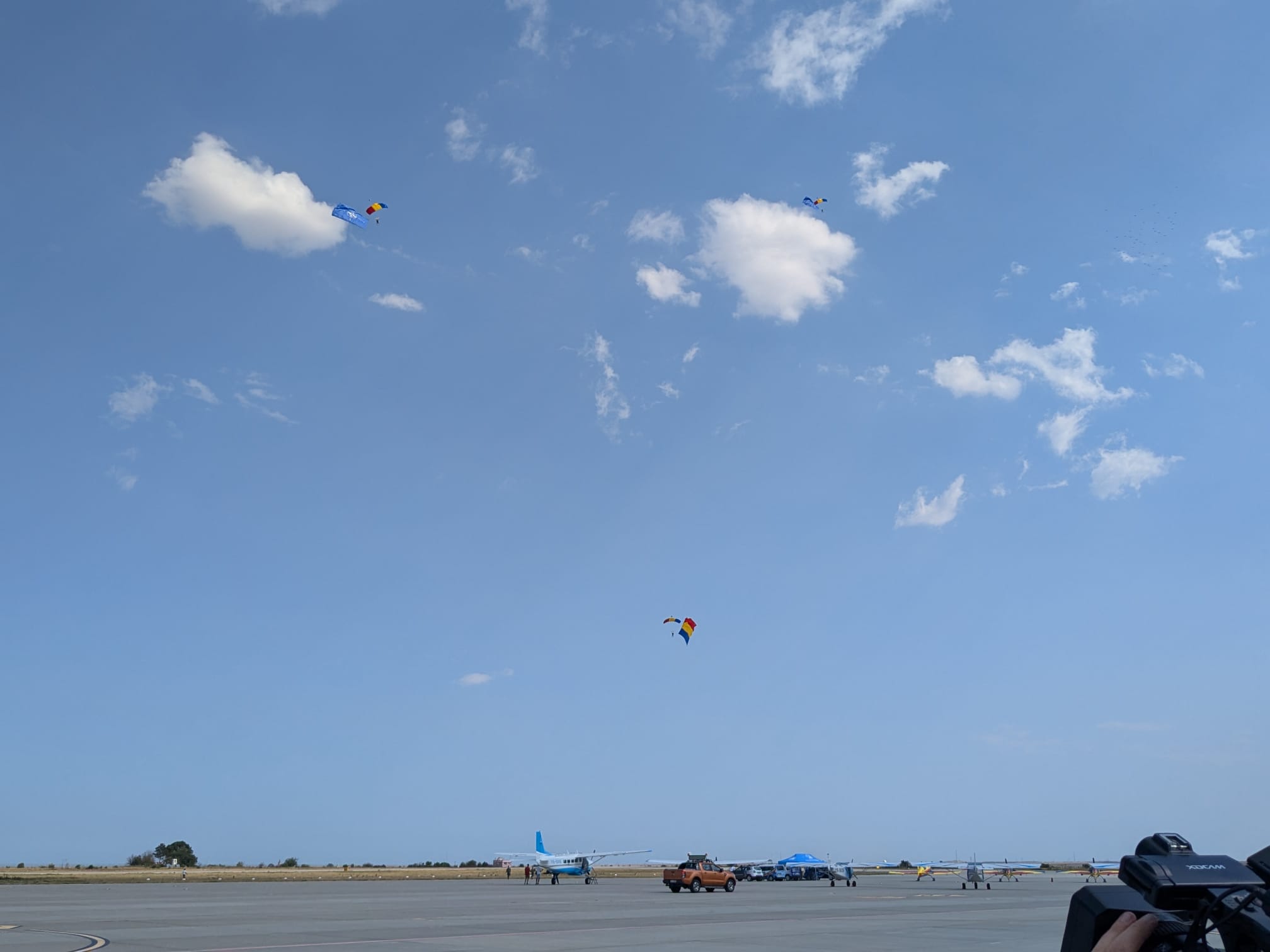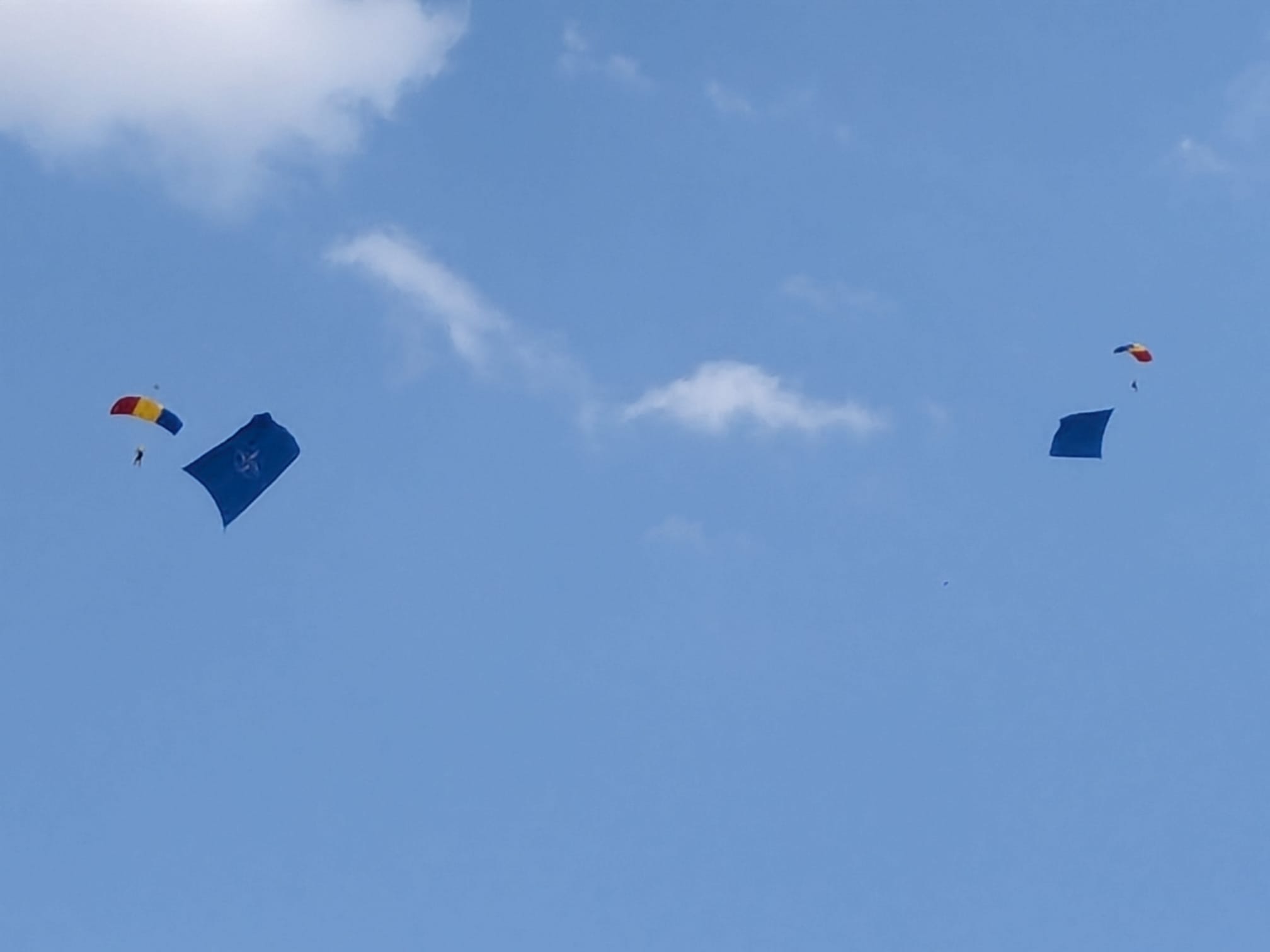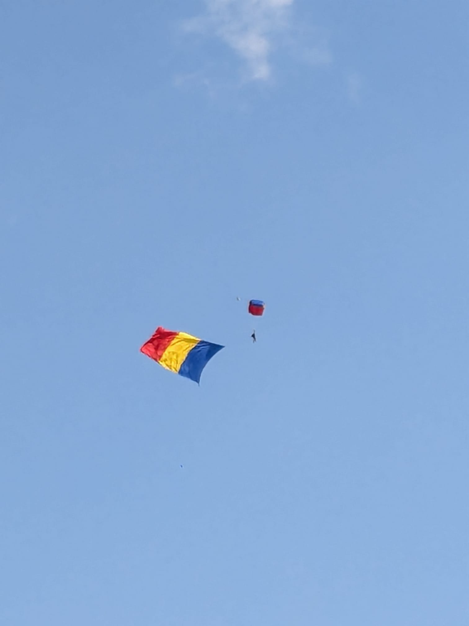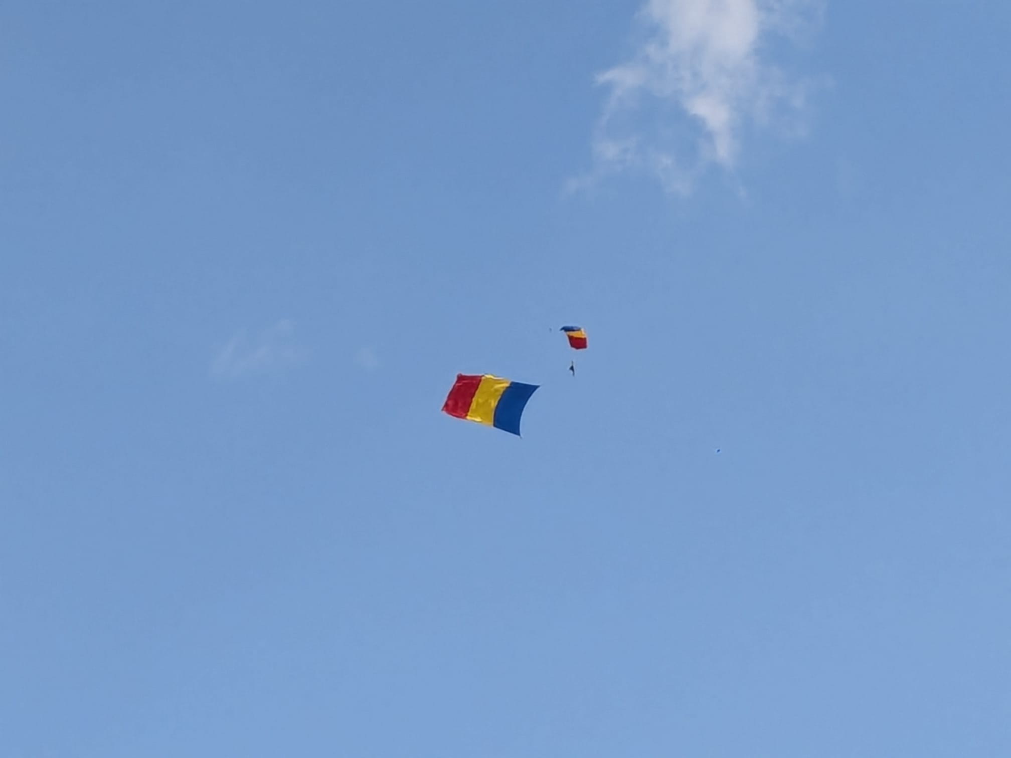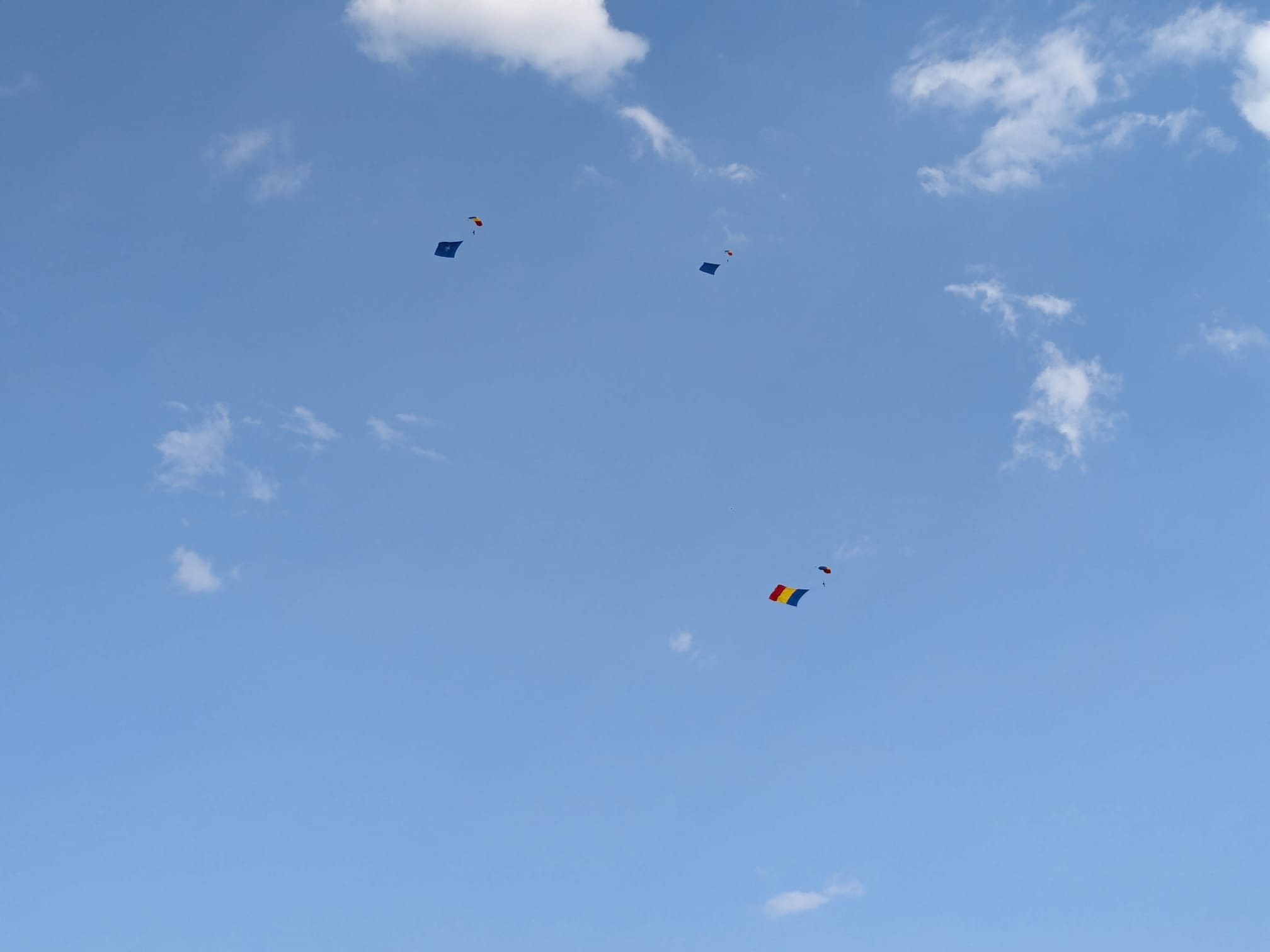 Trei militari din Forțele Aeriene au sărit cu parașutele de la 1500 de metri fiecare cu câte un drapel: cel național, cel al NATO și al Uniunii Europene.