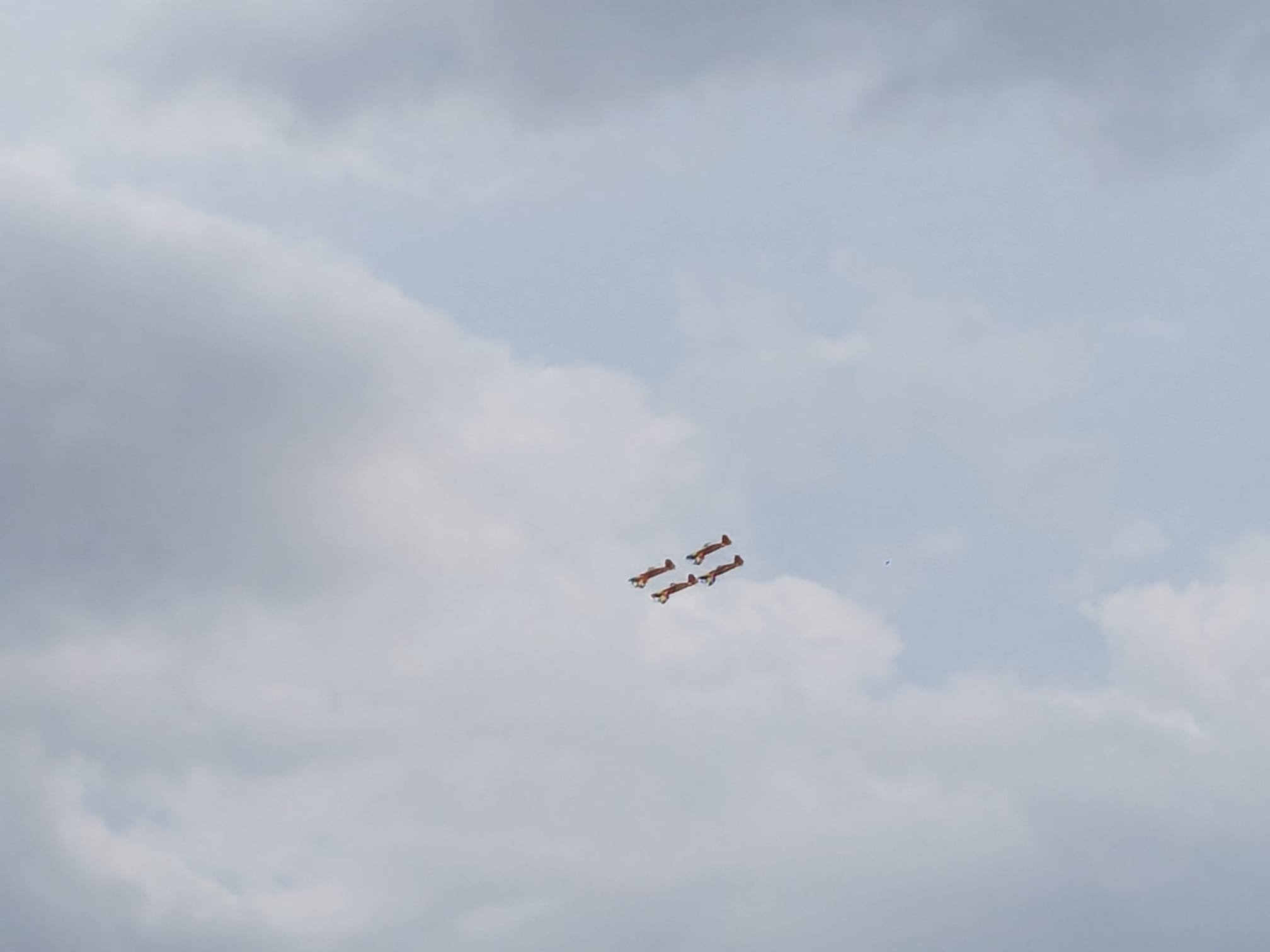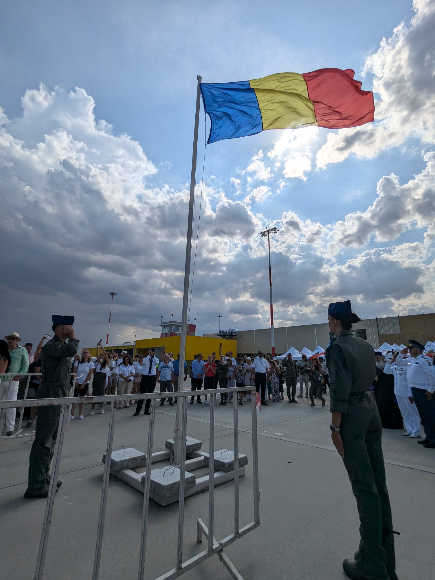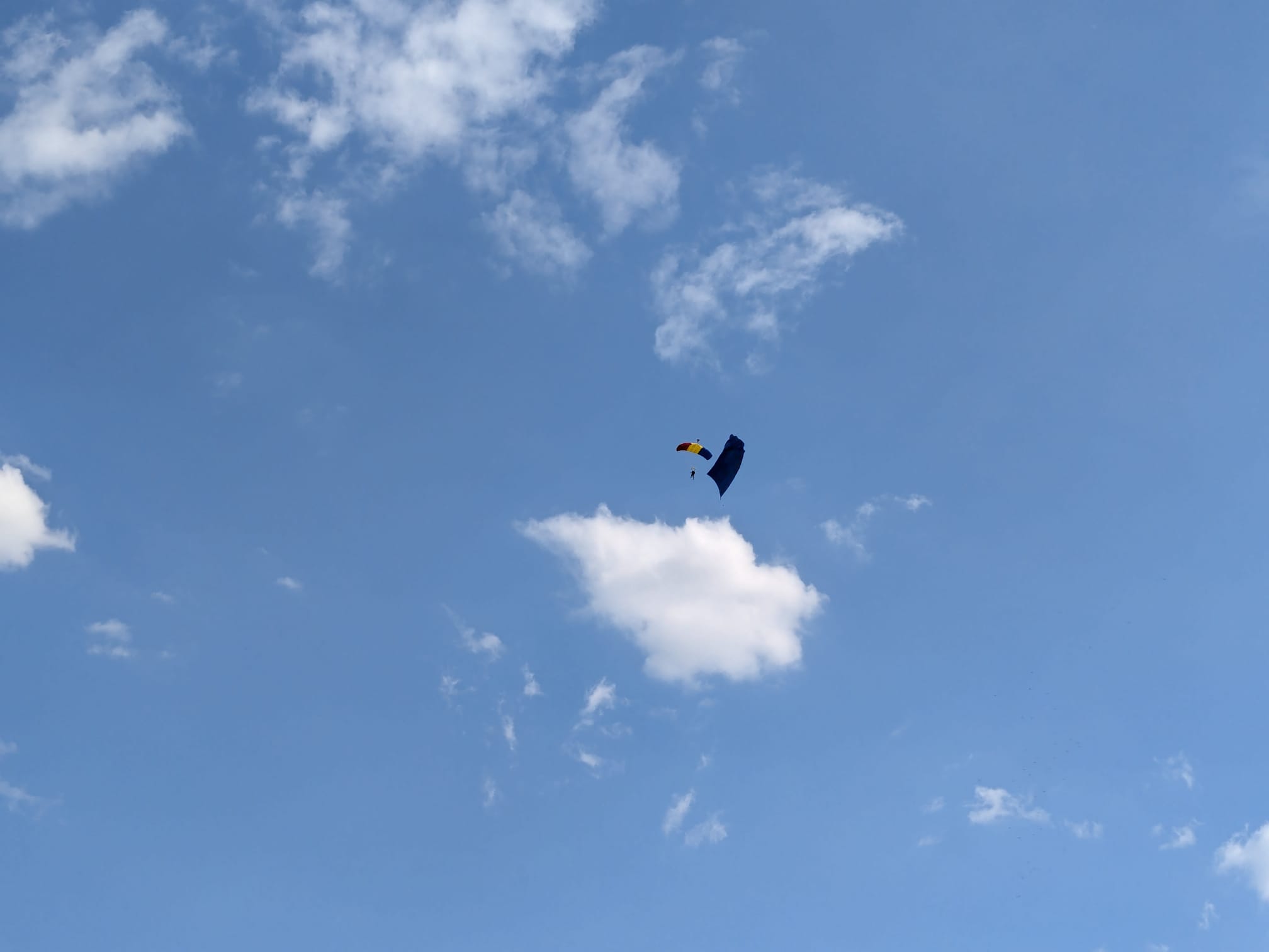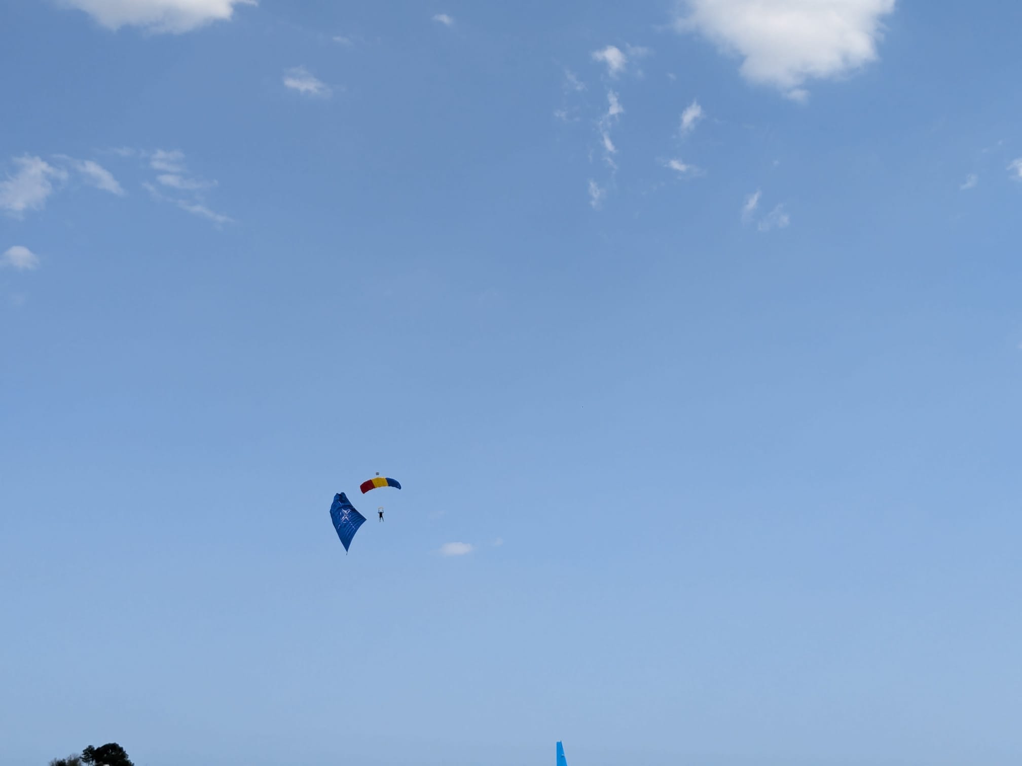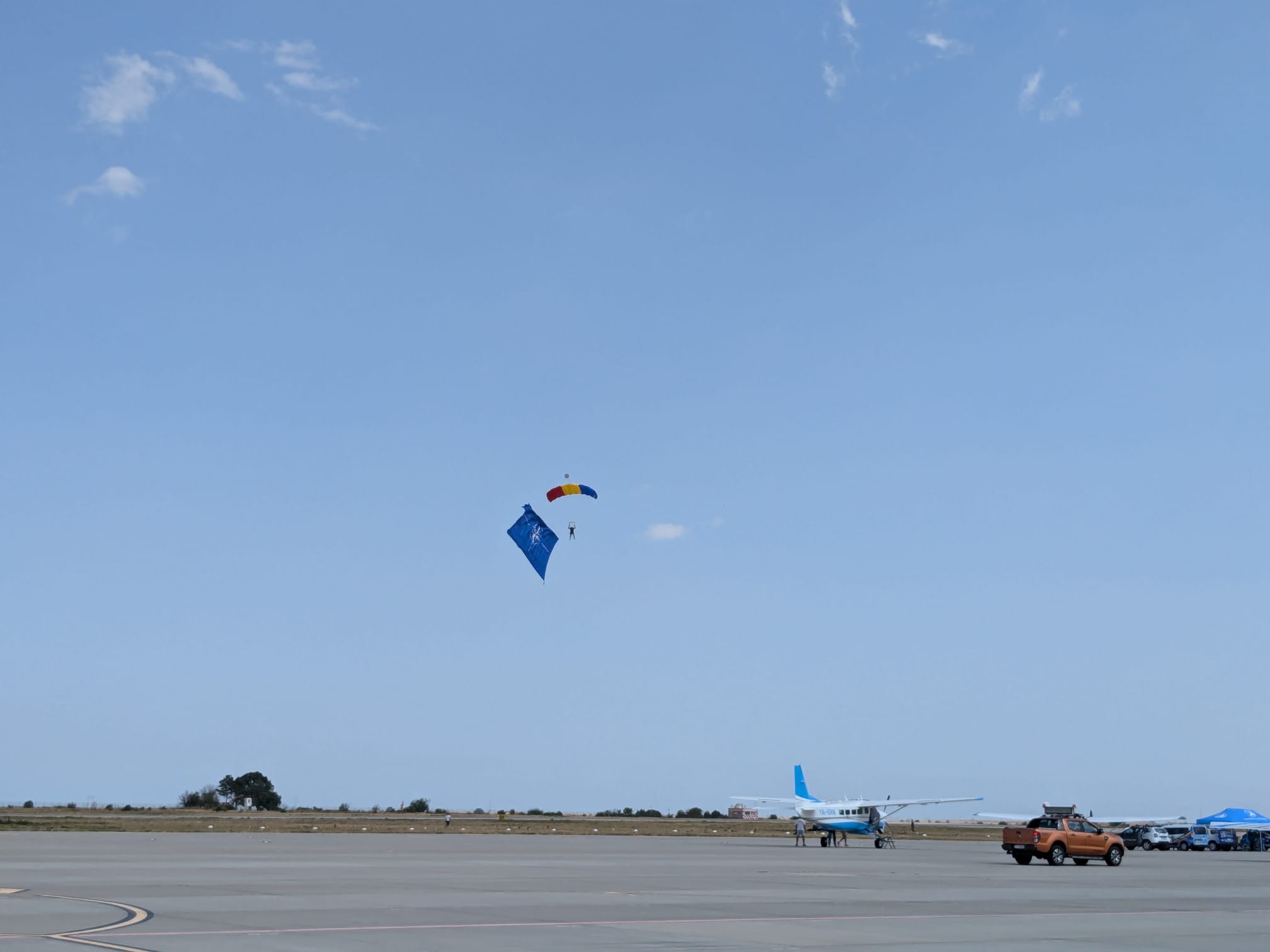 Trei militari din Forțele Aeriene au sărit cu parașutele de la 1500 de metri fiecare cu câte un drapel: cel național, cel al NATO și al Uniunii Europene.