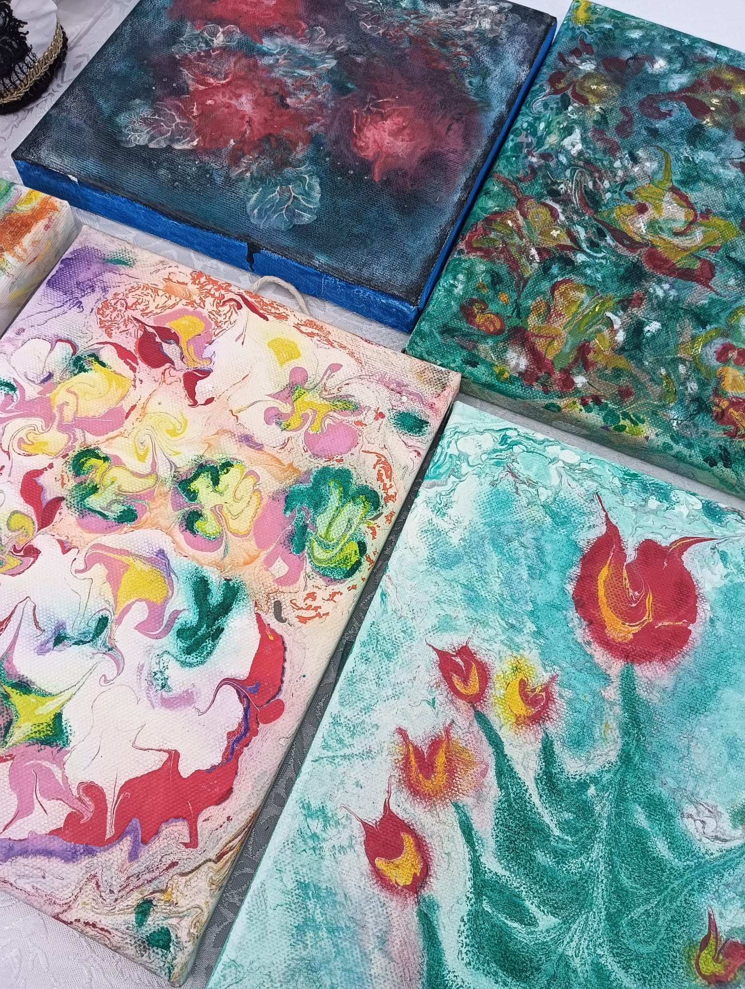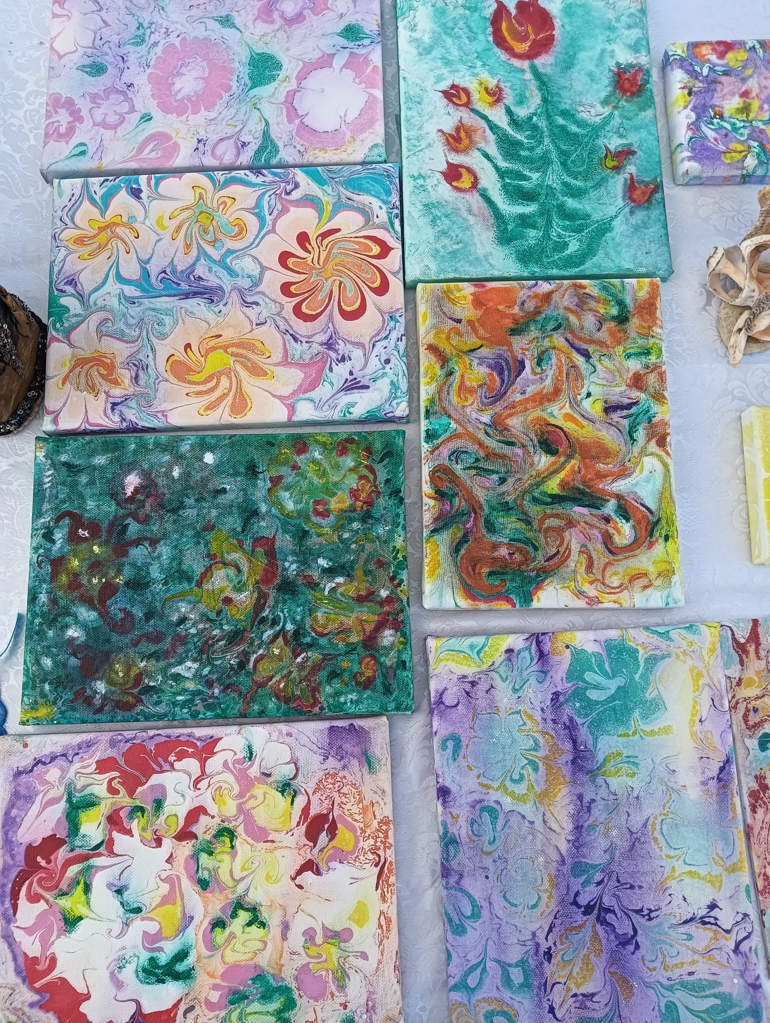 Anul acesta începând să lucrez și tehnica EBRU, am introdus și tablourile de EBRU pe apă, care este tradițional imperului, Otoman și Turciei. Am realizat cu copiii la Centrul Județean de Resurse și Asistență Educațională Constanța. Am participat la două concursuri anul acesta, iar copiii au câștigat premiu special și încă un premiu premiu întâi. Cu aceste tablouri vor fi valorificate, iar banii vor merge la copiii de la centru.