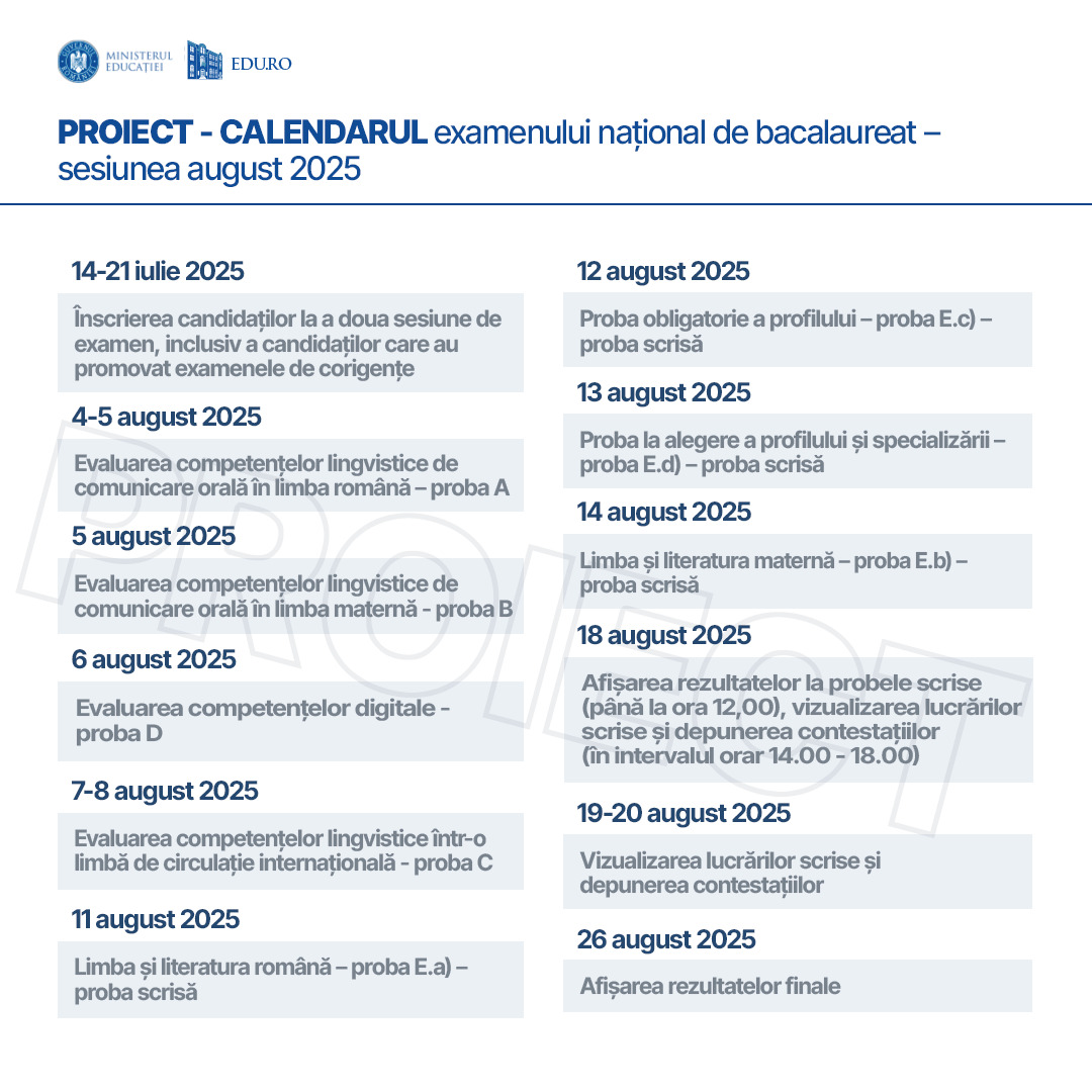 În privinţa datelor pentru desfăşurarea probelor examenelor naţionale (EN VIII şi Bacalaureat 2025), Ministerul Educaţiei propune: