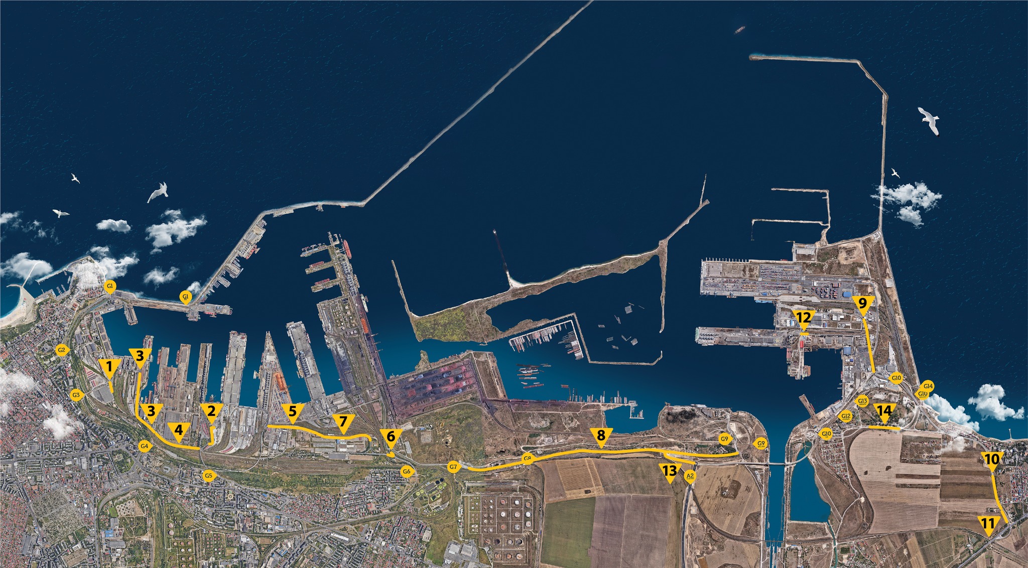 În portul Constanța – zona Midia vor fi asfaltate: drumul de acces în portul Midia, drumul Poarta 2 – linie CF – Poarta 3, drumul Poarta 3 – Poarta 4 și sub conducta Rompetrol, până în poarta 2 (drum tronson IV).