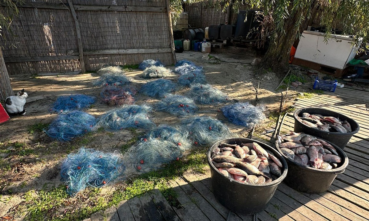 Pe lacul Sinoe, aceștia au identificat mai multe plase de pescuit monofilament, în care se aflau capturate aproape 180 de kilograme de pește din diferite specii.
