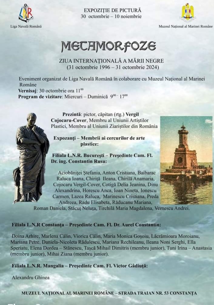 Cu Ocazia Zilei Internaționale a Mării Negre, Liga Navală Română a organizat joi, 30 octombrie, la Muzeul Marinei Române, expoziția de pictură “Metamorfoze”, vernisată de căpitan (rtg.) Vergil Cojocaru-Cover, membru al Uniunii Artiștilor Plastici și membru al Uniunii Ziariștilor din România.