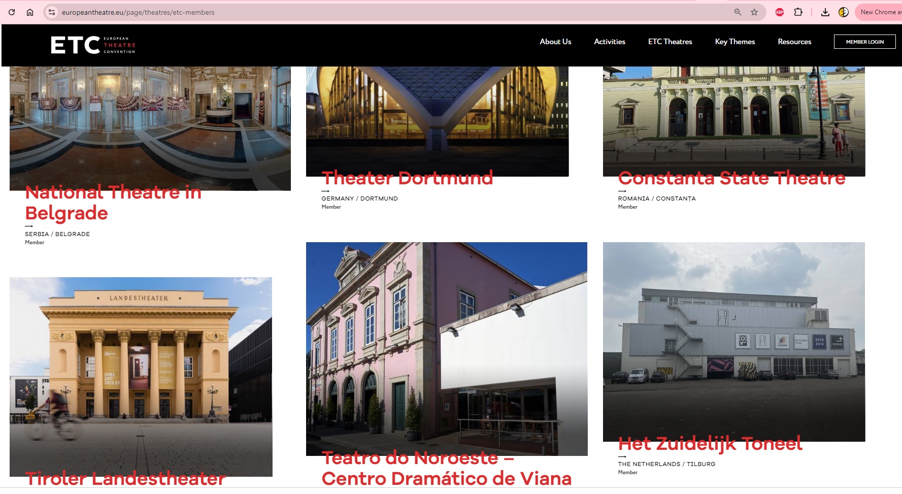 Printre teatrele membre ale ETC se numără: Deutsches Theater Berlin (Germania), Staatsschauspiel Dresden (Dresda, Germania), Théâtre National de Bretagne (Franța), Théâtre de Liège (Belgia), Sao Luiz Teatro Municipal (Lisabona, Portugalia), Teatro Arriaga Antzokia (Bilbao, Spania), Malmö Stadsteater (Suedia), Tiroler Landestheatre (Austria), Theater Dortmund (Germania), Teatro Stabile di Torino (Italia), Teatrul și Orchestra din Heidelberg (Germania), Teatrul Național al Greciei din Atena, Teatrul Royal Lyceum (Edinburgh – Scoția), Det Norske Teatret (Oslo, Norvegia), Schauspielhaus Zürich (Elveția), De Toneelmakerij (Amsterdam, Olanda), Teatrul Național Croat din Zagreb (Croația), Teatrul Național din Praga (Cehia), Teatrul Național din Belgrad (Serbia), Schauspielhaus Salzburg (Austria), Teatrul Național din Muntenegru – Podgorica, Teatrul Național din Albania – Tirana, Centrul de Arte Contemporane Dakh (Kiev, Ucraina), Festivalul Internațional de Teatru din Tbilisi (Georgia) etc.