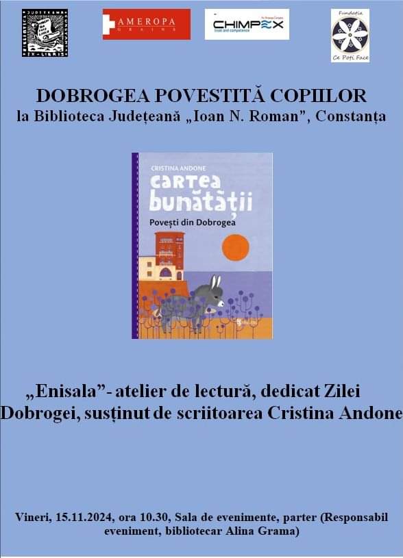 Cum poate un copil înțelege și celebra Ziua Bunătății (13 Noiembrie) și, deopotrivă, Ziua Dobrogei dacă nu prin întâlnirea cu scriitoarea Cristina Andone și volumul său „Cartea bunătății – Povești din Dobrogea”. Pe 15 Noiembrie, scriitoarea ne invită într-o incursiune în Tărâmul Bunătății, cu oameni ce înoată alături de delfini, ce sunt deopotrivă ai pământului și ai apelor, cu cetăți și neamuri ce au rămas pe acest meleag în bună pace, cu prințese genoveze, cu salepgii turci, cu ciobani ce înving, precum zeul Mithra, dragoni misterioși, cu realități istorice dobrogene, îmbrăcate în imaginarul necesar sufletului de copil. Evenimentul se va desfășura în Sala de evenimente a Bibliotecii Județene Constanța, în intervalul orar 10.30 – 12.00.