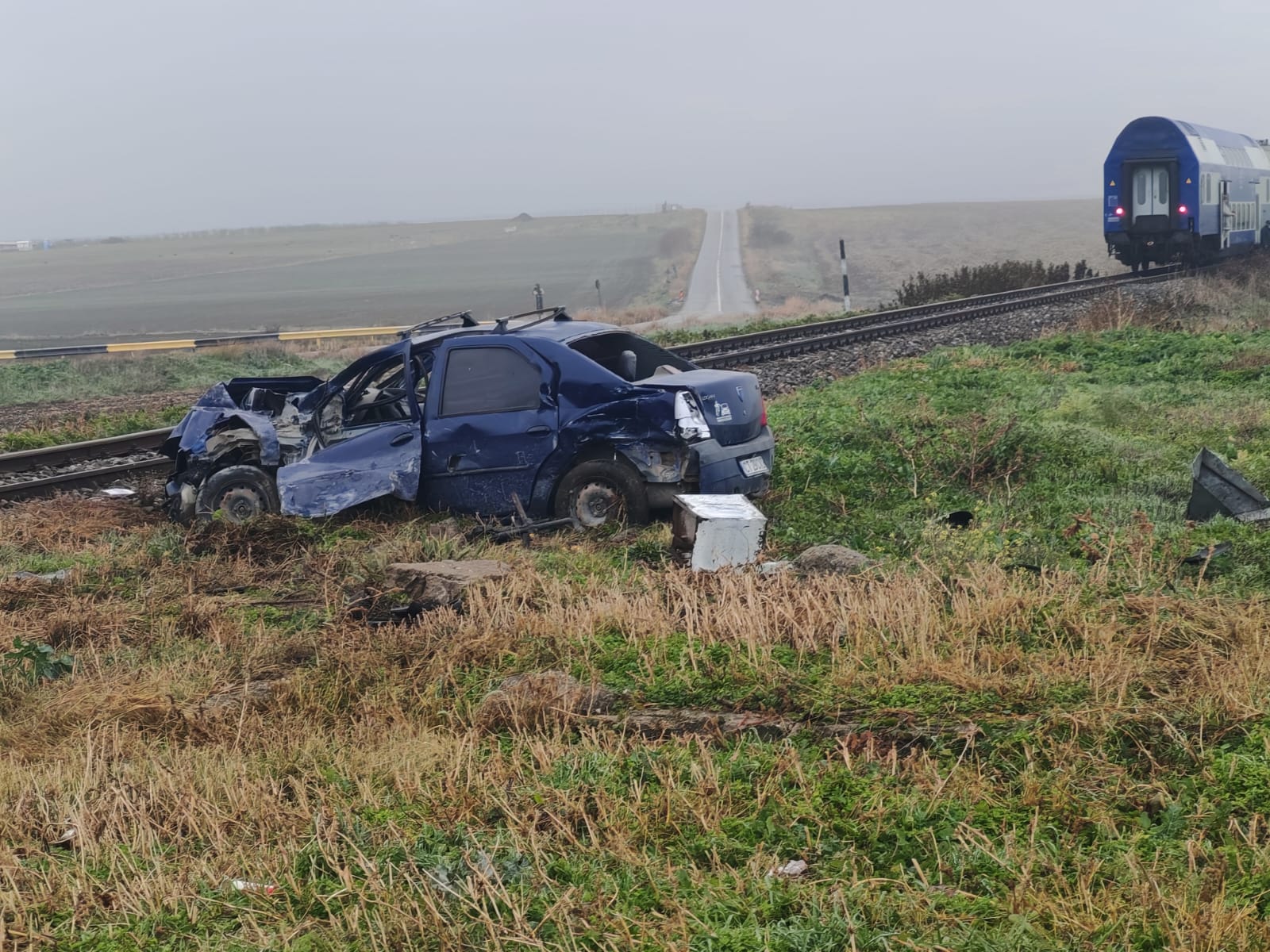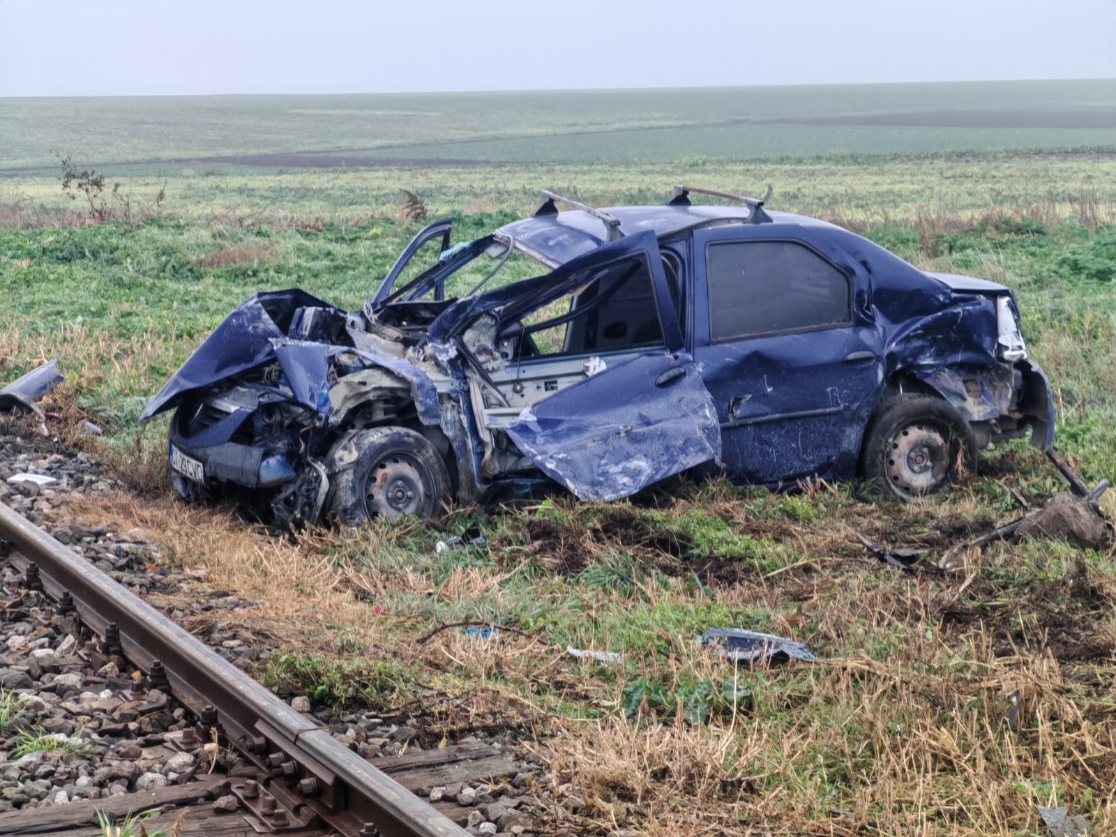 FOTO | Accident feroviar la Târgușor. O mașină a fost lovită de tren și proiectată pe câmp