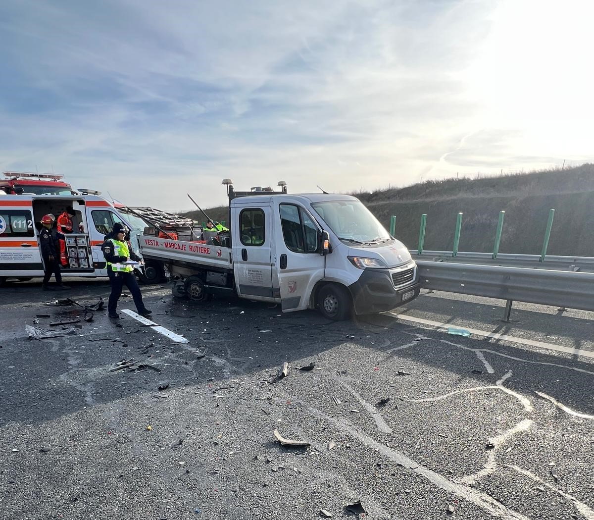 Potrivit ISU Constața, în accident au fost implicate o autoutilitară destinată lucrărilor pe autostradă, semnalizată corespunzător și care staționa în momentul în care a fost lovită din spate, și un autoturism, condus de o femeie în vârstă de 30 de ani, care a izbit violent autoutilitara.