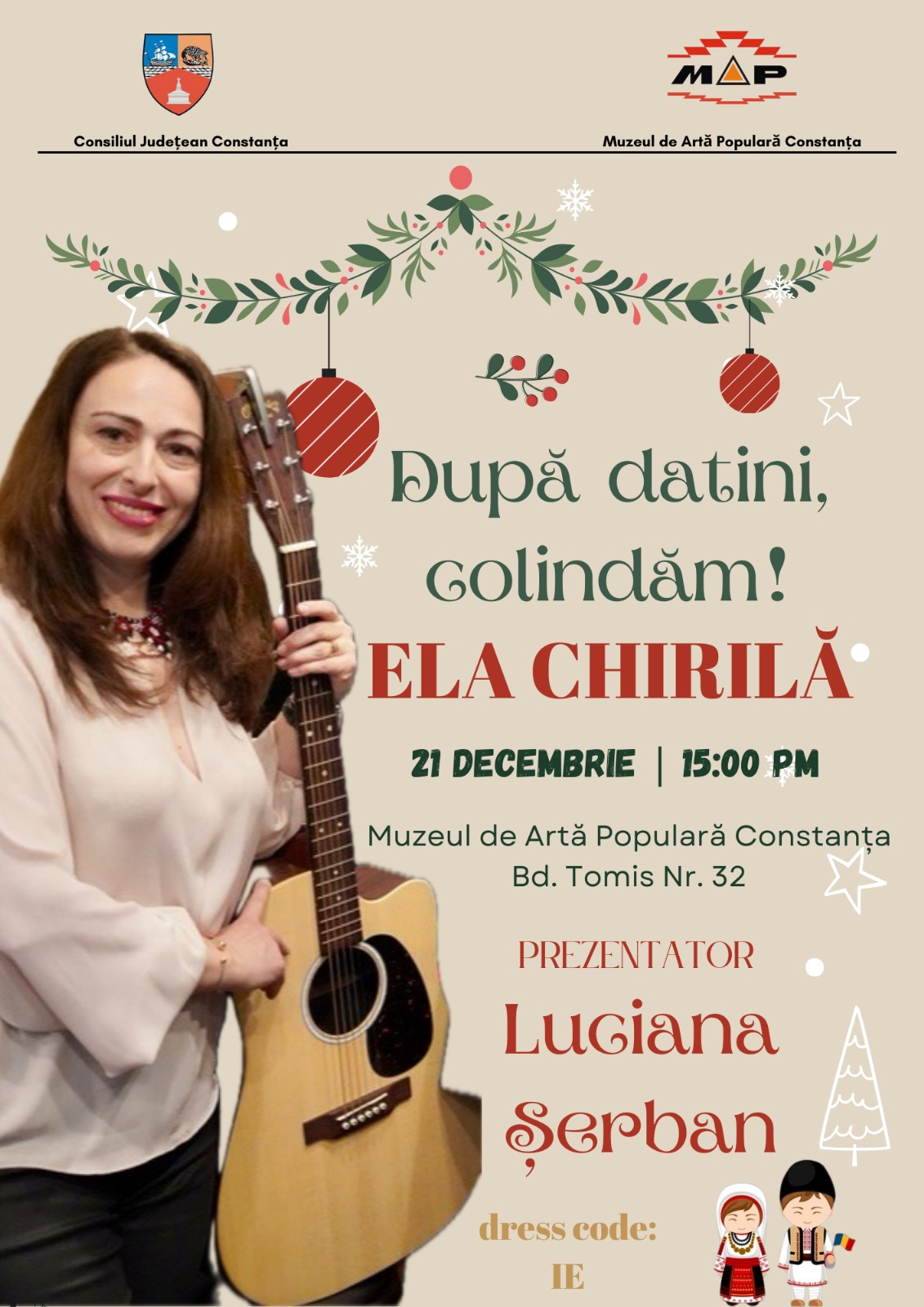 Muzeul de Artă Populară Constanța organizează sămbătă, 21 decembrie, ora 15.00, concertul de colinde „După datini, colindăm”, susținut de Ela Chirilă. La eveniment va participa și grupul de copii „Steluțele Crăciunului” de la Grădinița nr. 57 din Constanța, coordonați de prof. ed. timpurie Mădălina Bujor.