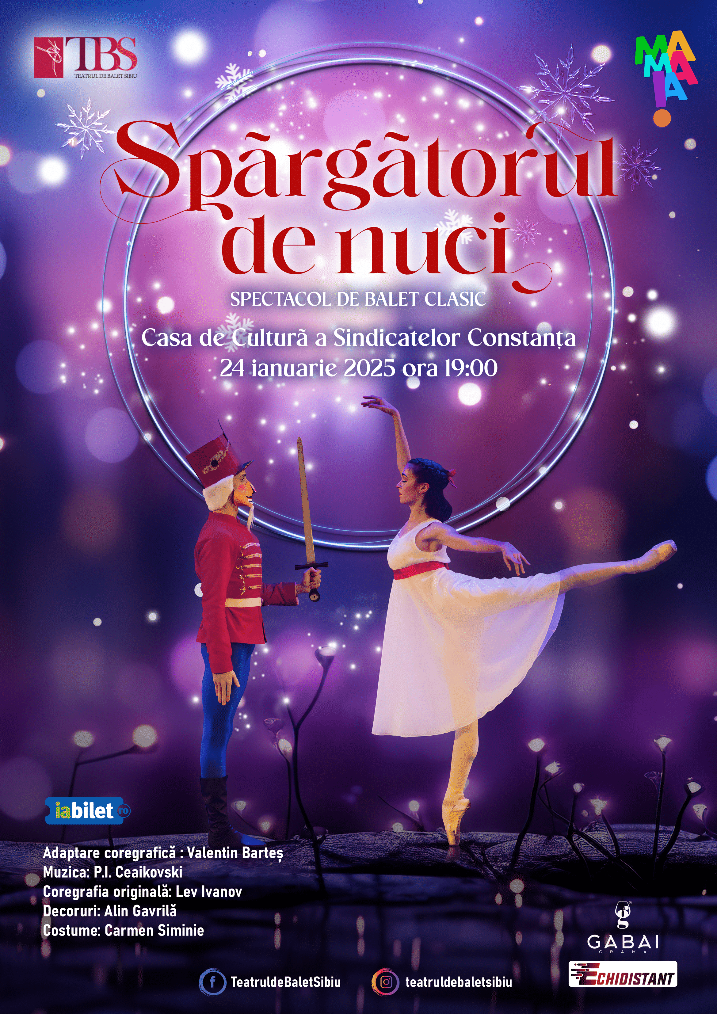 Pe 24 ianuarie 2025, de Ziua Unirii Principatelor Române, Casa de Cultură din Constanța devine gazda unui eveniment de excepție: spectacolul de balet clasic „Spărgătorul de nuci”, prezentat de renumitul Teatru de Balet Sibiu. Începând cu ora 19:00, sunteți invitați să vă lăsați captivați de această poveste magică și atemporală, inspirată de celebra creație a lui E.T.A. Hoffmann.