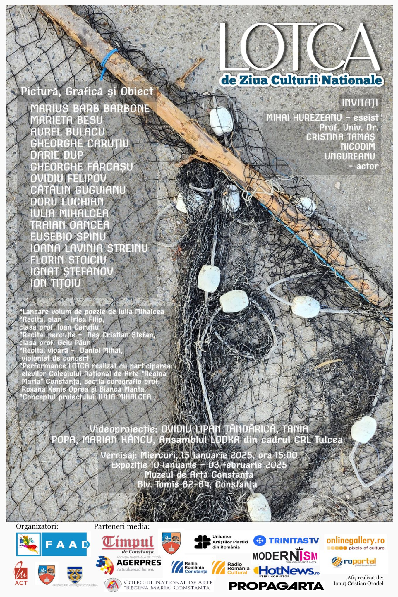 Miercuri, 15 ianuarie 2025, ora 15:00, de Ziua Culturii Naționale, la Muzeul de Artă Constanța, va avea loc vernisajul expoziției Proiectului Cultural ,,LOTCA”, în care arta își va găsi expresie pe diferite căi: muzică, imagine, sunet.