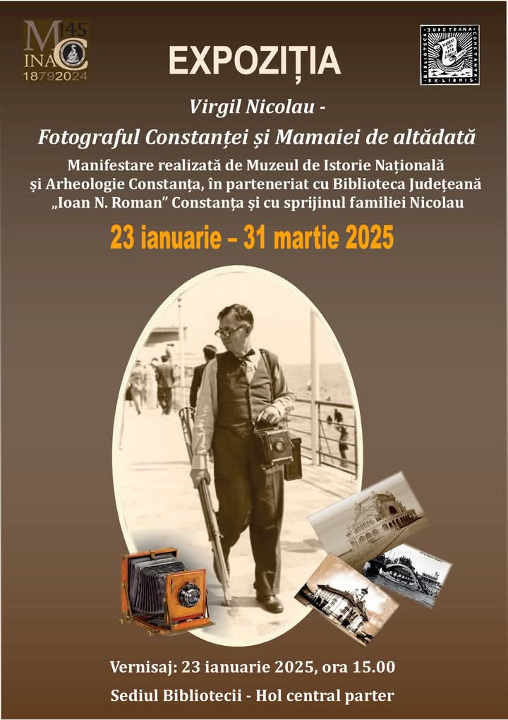 Expoziția „Virgil Nicolau–Fotograful Constanței și Mamaiei de altădată” va fi deschisă în perioada 23 ianuarie – 31 martie 2025, la sediul Bibliotecii Județene „I.N.Roman” Constanța, parter, holul central.