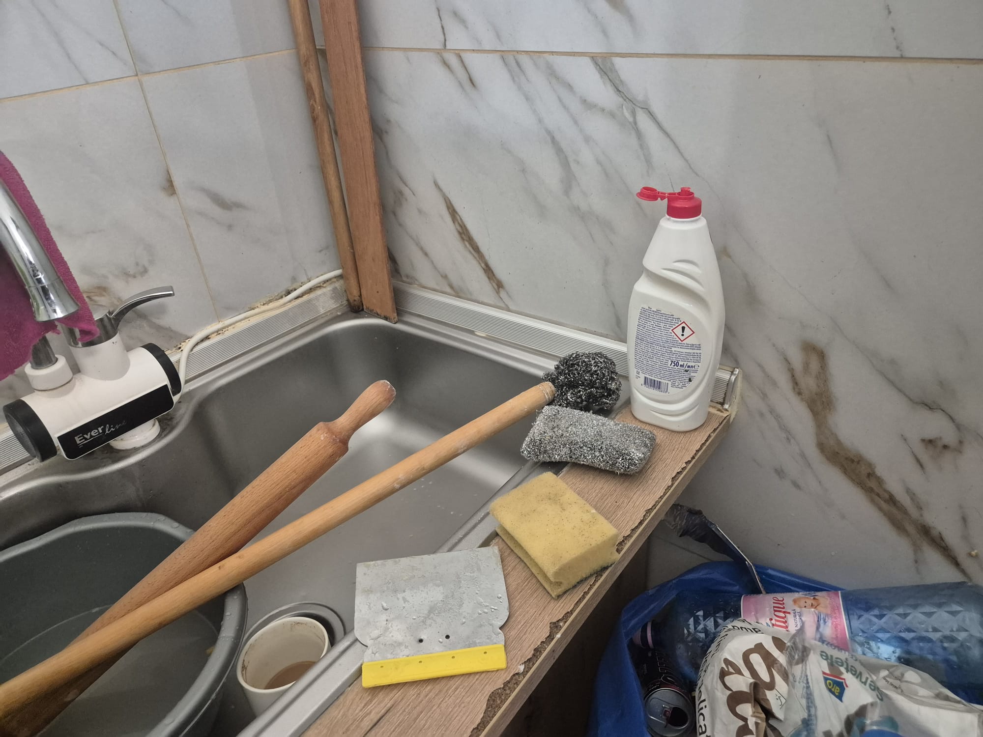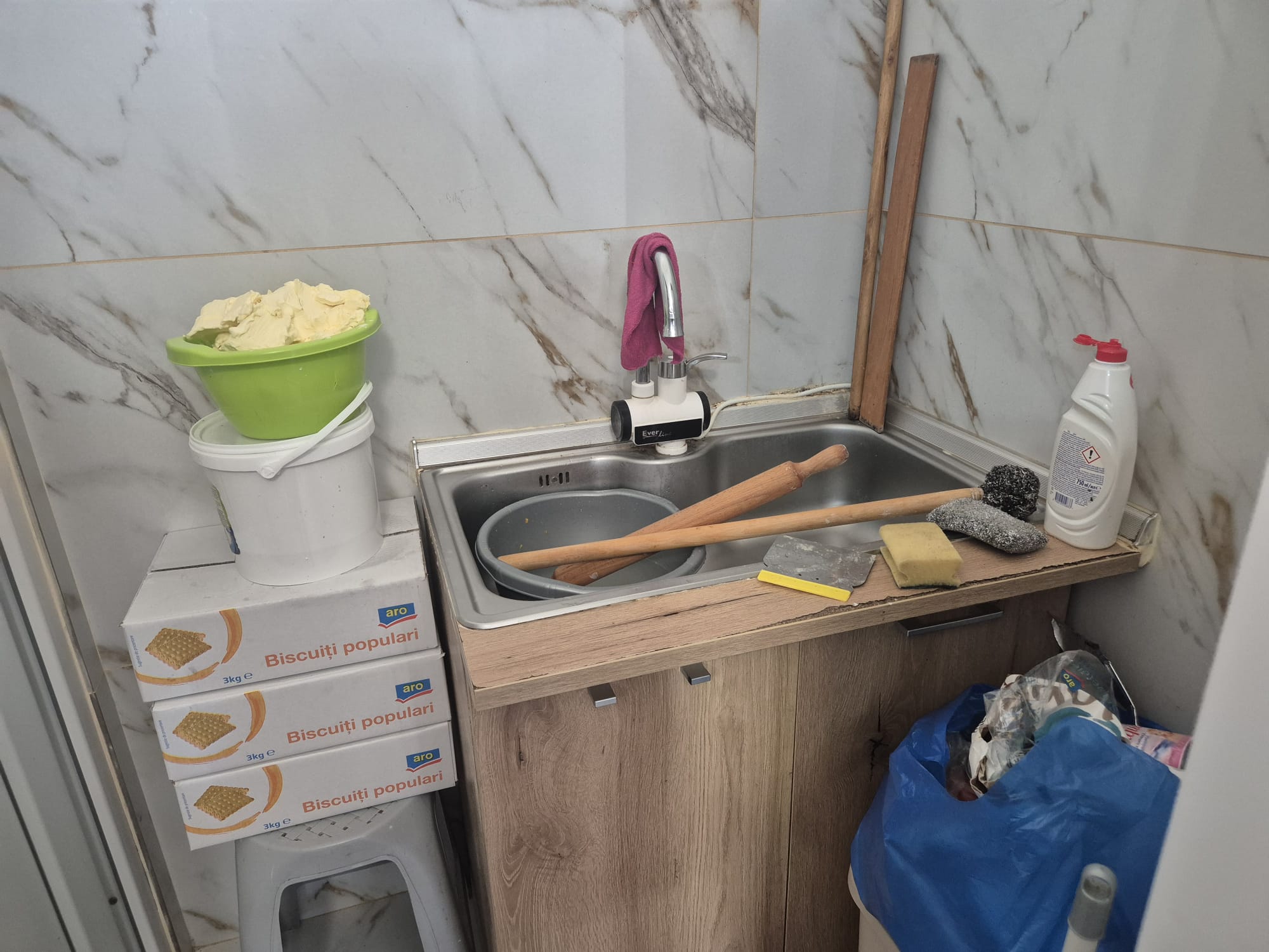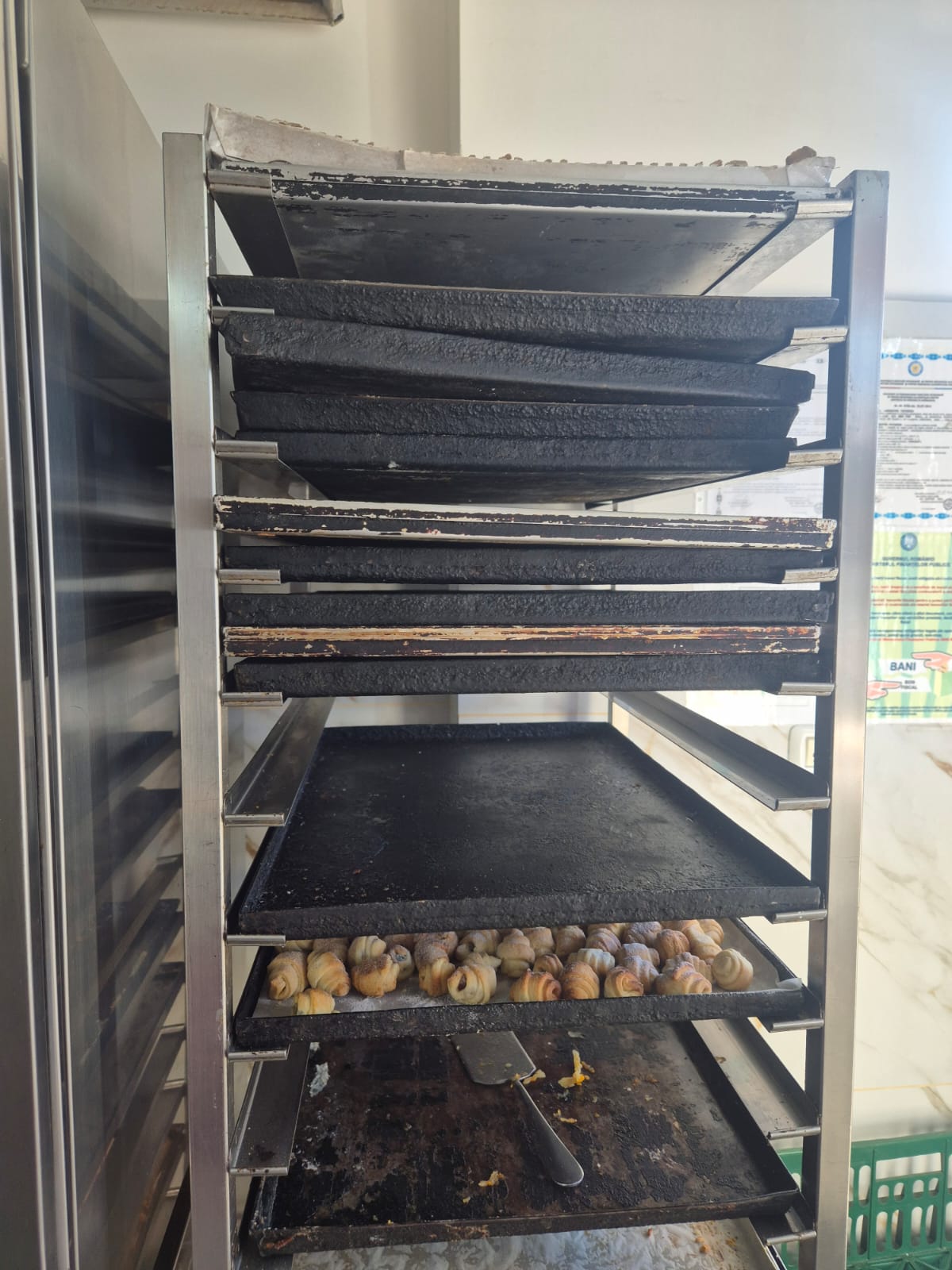 Se folosesc tăvi cu depuneri grosiere de arsură pentru prepararea produselor. Există o singură chiuvetă în care se spală atât fructele , legumele, ouăle cât și oalele și ustensilele. Coșul de gunoi nu are capac cu acționare la picior, acesta fiind încărcat peste capacitate și fiind amplasat, mai exact lipit de frigiderul în care erau depozitate o parte din materiile prime. Lângă ușa toaletei (care era deschisă) era un lighean plin cu margarină neacoperit. Chederele de la frigiderul de mâna erau deteriorate, rupte și neigienizate”, transmite CJPC.