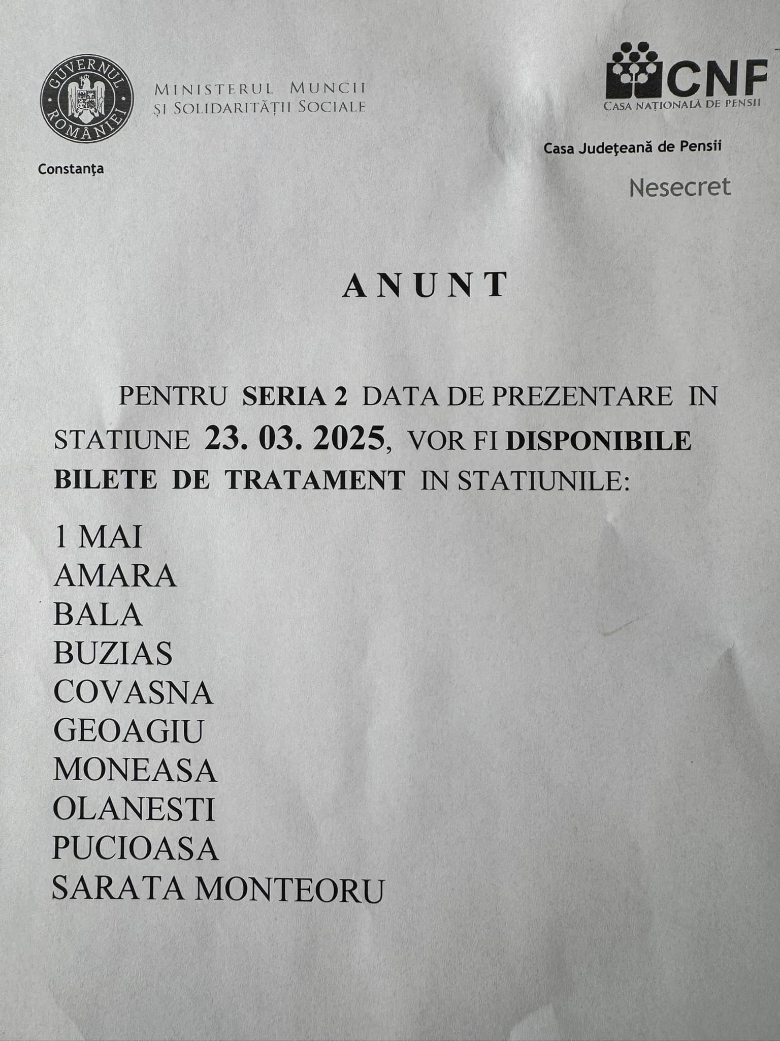 Casa Județeană de Pensii Constanța are disponibile 70 de bilete în stațiuni, cu prezentare la tratament pe 23 martie.