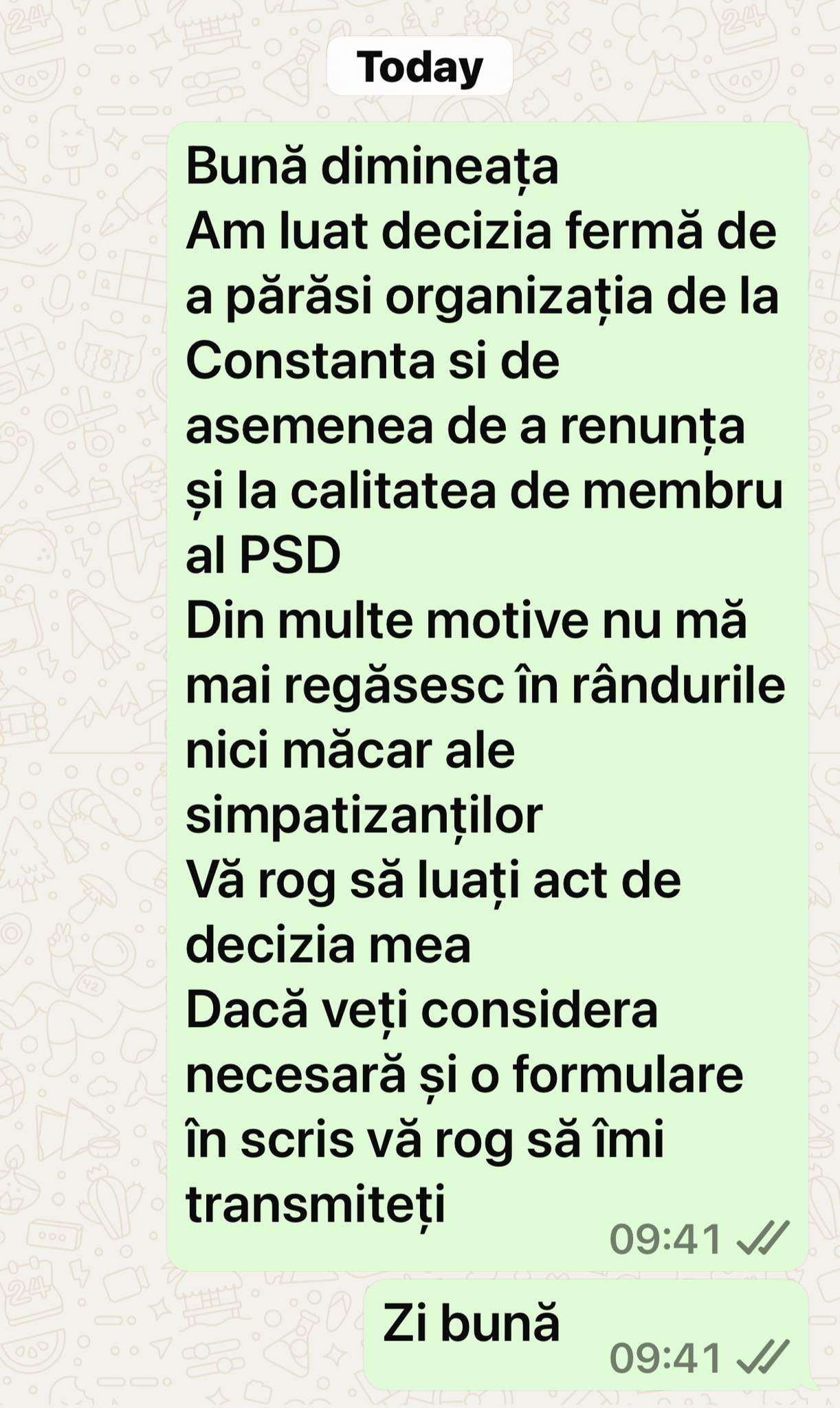 Acesta a mai precizat că decizia lui a fost transmisă și președintelui Organizatiei Județene a PSD – Constanța.