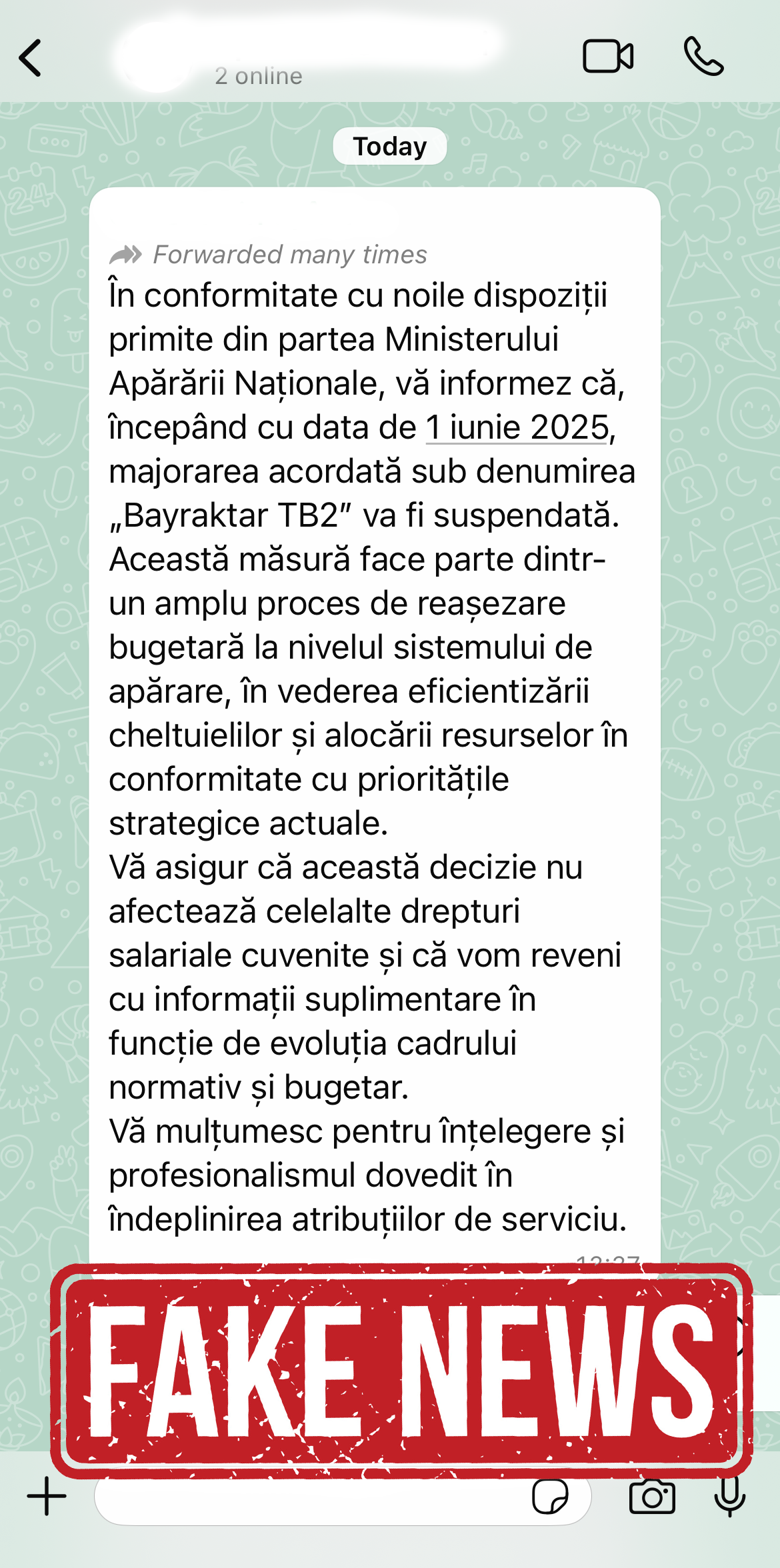 Ministerul Apărării Naționale dezminte categoric această informație falsă, care are în mod evident rolul de a induce confuzie și îngrijorare în rândul personalului care își desfășoară activitatea în Sistemul Național de Apărare, Ordine Publică și Securitate Națională.
