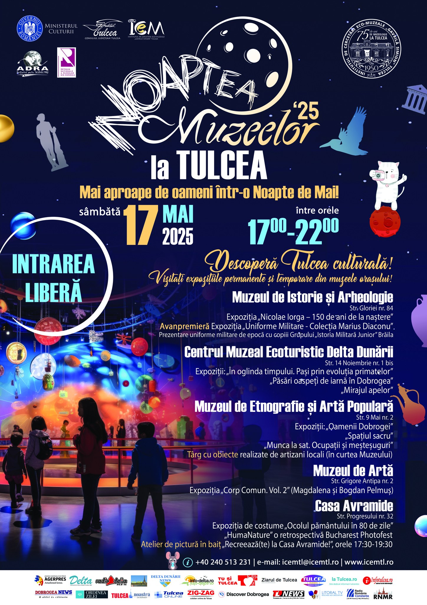 Sâmbătă, 17 mai 2025, va avea loc Noaptea Muzeelor la Tulcea, parte a evenimentului național cu tema „Mai aproape de oameni într-o noapte de mai”, organizat de Rețeaua Națională a Muzeelor din România, sub egida Ministerului Culturii.
