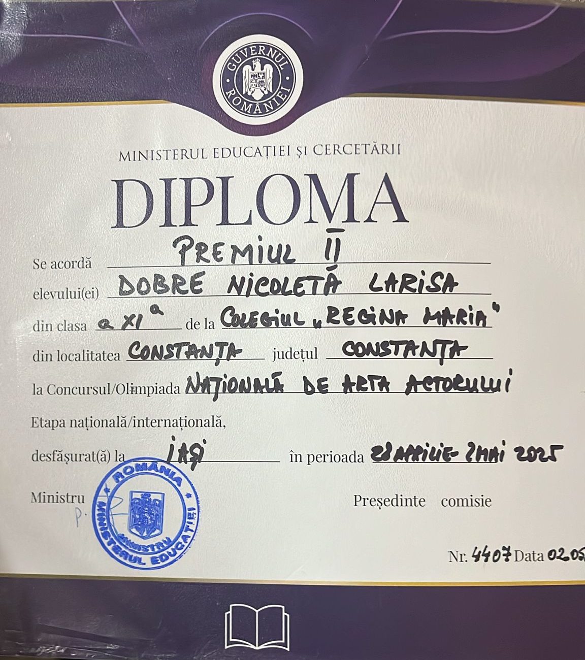 Nicoleta Larisa Dobre, eleva clasei a XI-a a Colegiului Național de Arte “Regina Maria” din Constanța  a obținut premiul II la Olimpiada Națională de Arta Actorului, desfășurată anul acesta la Iași. A fost o experiență foarte frumoasă, în care tânăra de 17 ani de la malul mării a înțeles că teatrul este viața sa. Când pășește pe lemnul scenei, când se aprind reflectoarele și stă față în față cu publicul ne spune că trăiește o emoție greu de descris în cuvinte, dar care ajunge, la oameni, de fiecare dată prin fiecare cuvânt și gest al său.  Nicoleta Larisa Dobre nu este la prima participare la o olimpiadă națională și nici la primul concurs de teatru, dar fiecare etapă o ajută să se cunoască mai bine și să se perfecționeze.