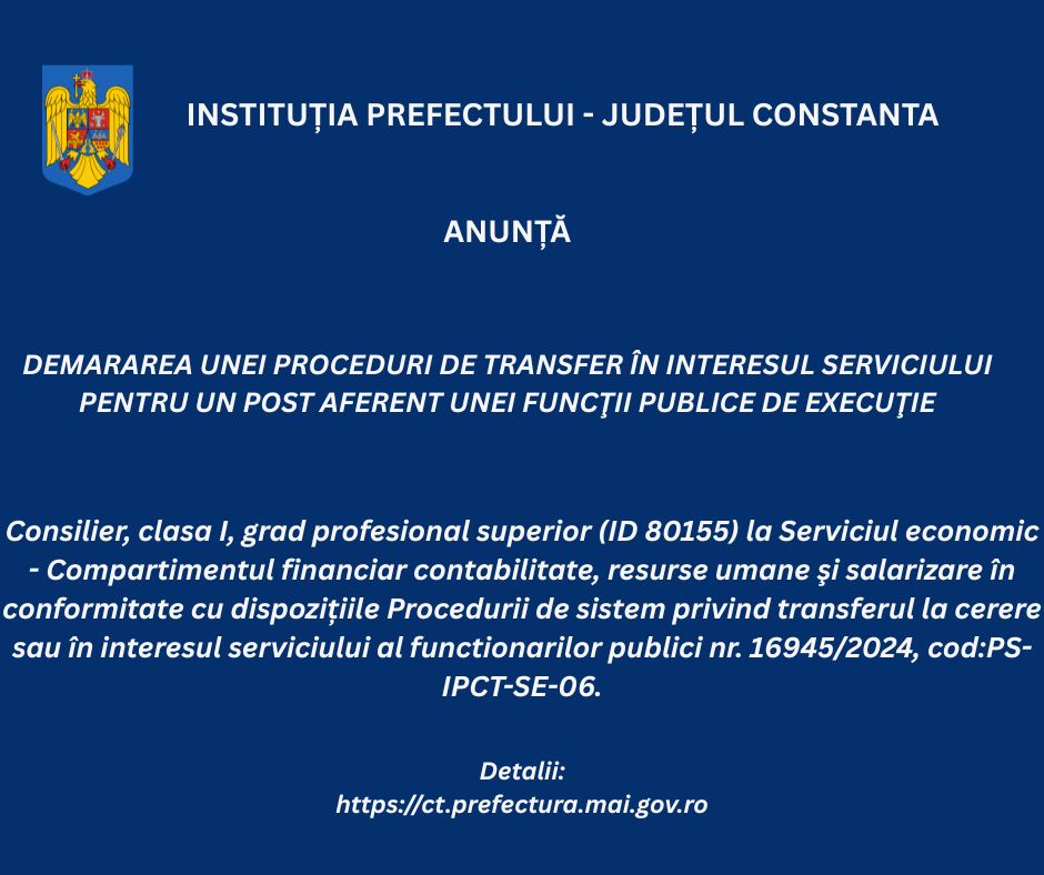 Instituția Prefectului – Județul Constanța: Procedură de transfer în interesul serviciului, pentru ocuparea unui post aferent unei funcţii publice de execuţie