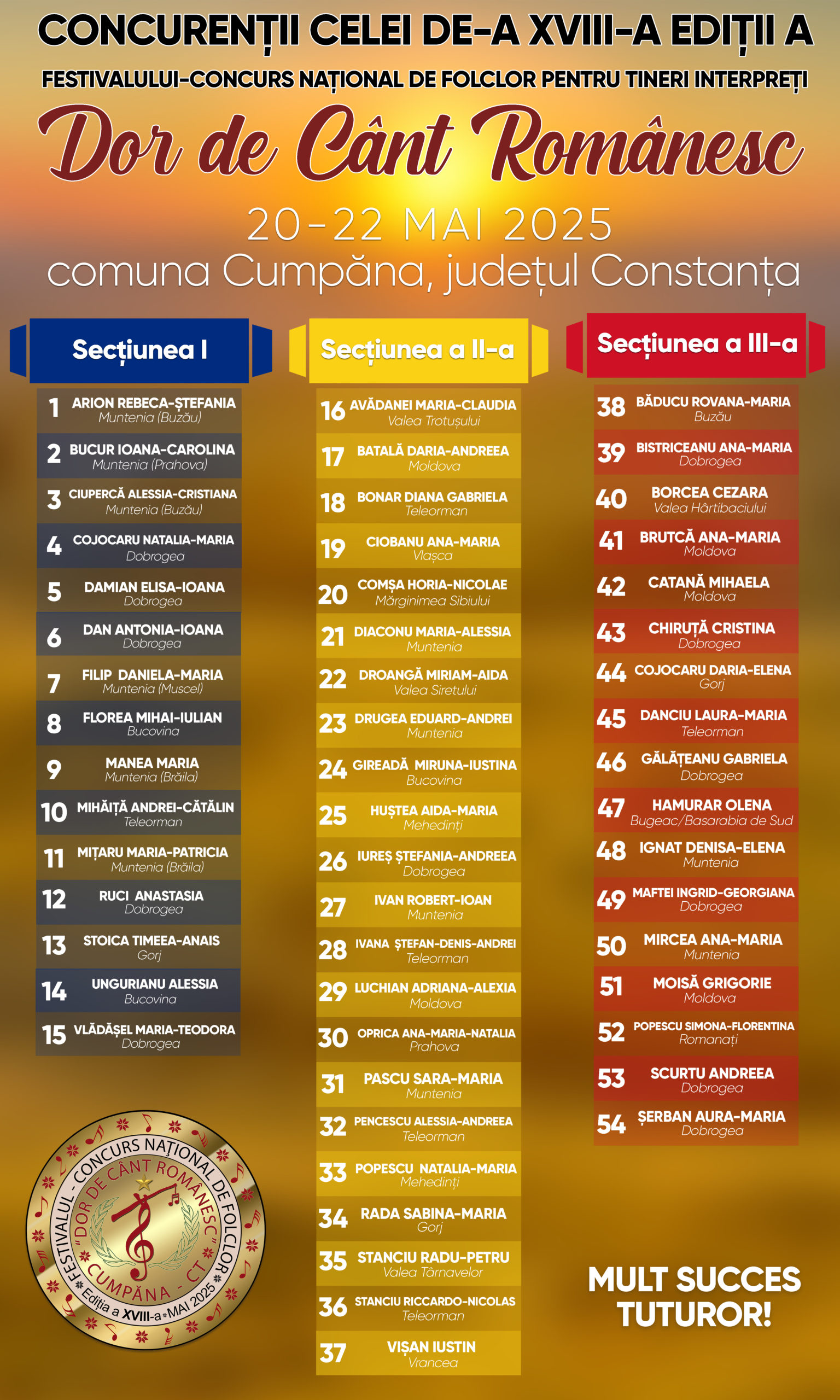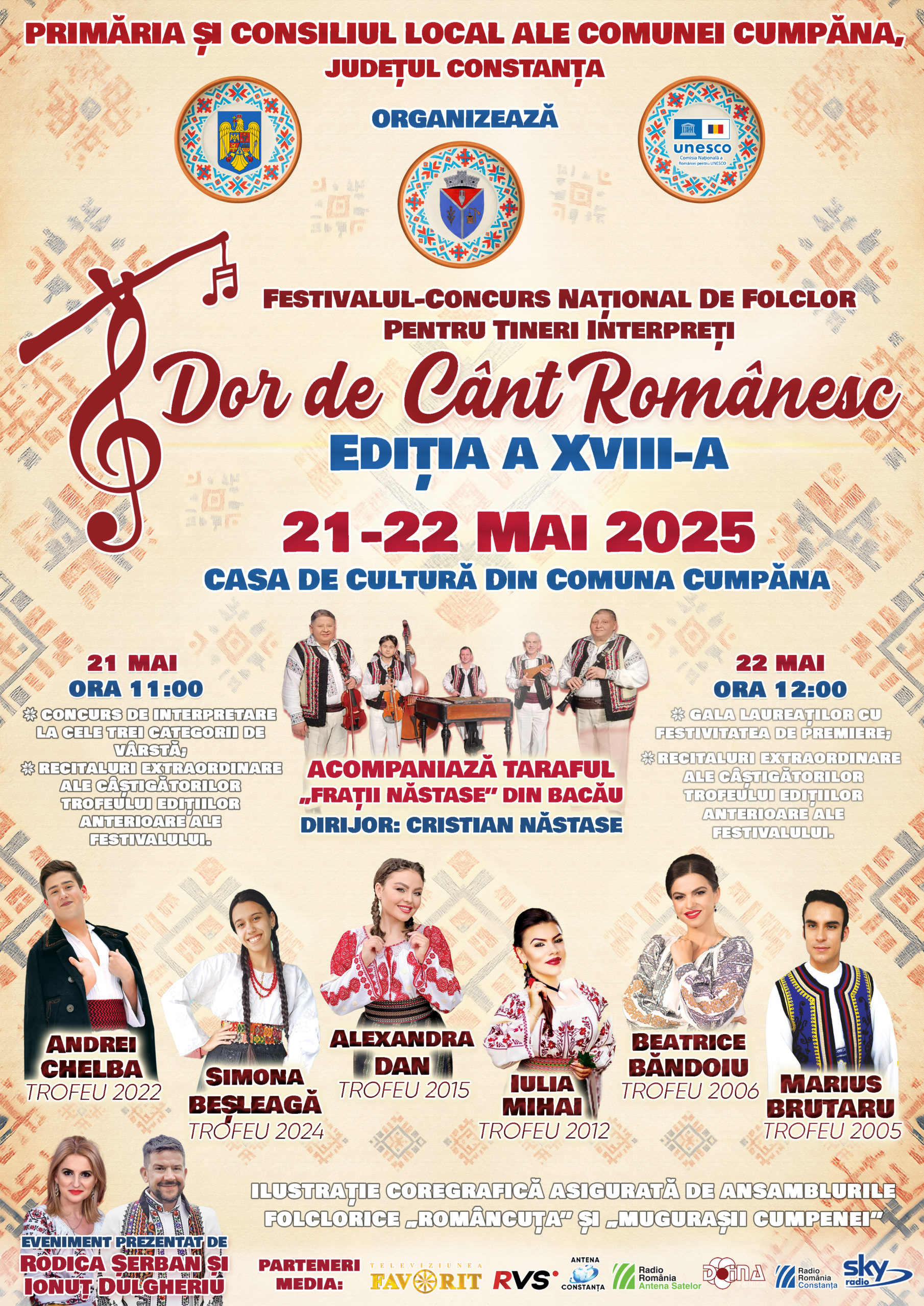 Evenimentul reunește tineri interpreți de muzică populară din toate zonele etnofolclorice ale țării și se va desfășura în perioada 20–22 Mai 2025, în cadrul Casei de Cultură din comuna Cumpăna, după următorul program: