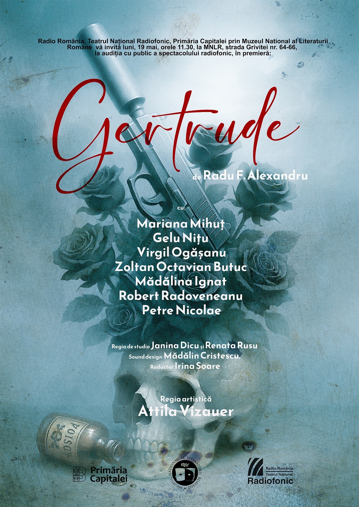 Teatrul Naţional Radiofonic a prezentat astăzi, la Muzeul Naţional al Literaturii Române – Teatrul Dramaturgilor Români, audiţia cu public a spectacolului radiofonic, în premieră: Gertrude de Radu F. Alexandru. Regia artistică: Attila Vizauer. În distribuţie: Mariana Mihuț, Gelu Nițu, Virgil Ogășanu, Zoltan Octavian Butuc, Mădălina Ignat, Robert Radoveneanu, Petre Nicolae. Regia de studio: Janina Dicu și Renata Rusu. Sound design: Mădălin Cristescu. Redactor: Irina Soare. Spectacolul se va difuza joi, 22 mai (partea I) și vineri, 23 mai (partea a II-a), la ora 22:00, la Radio Romania Cultural.
