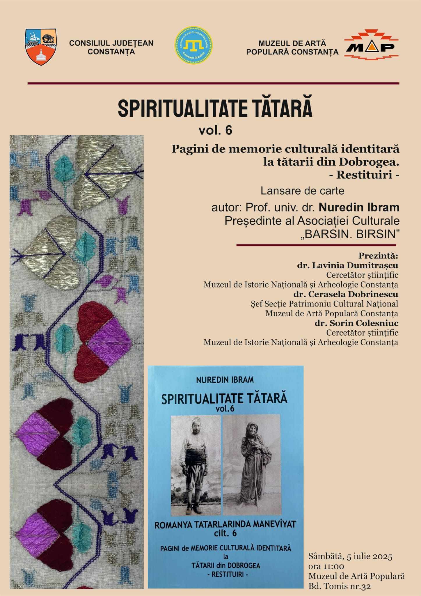 Sâmbătă, 5 iulie, de la ora 11.00, Muzeul de Artă Populară Constanța, instituție finanțată de Consiliul Județean Constanța, va găzdui lansarea volumului „Spiritualitate tătară. Pagini de memorie culturală identitară la tătarii din Dobrogea. Restituiri”, semnat de Prof. univ. dr. Nuredin Ibram.