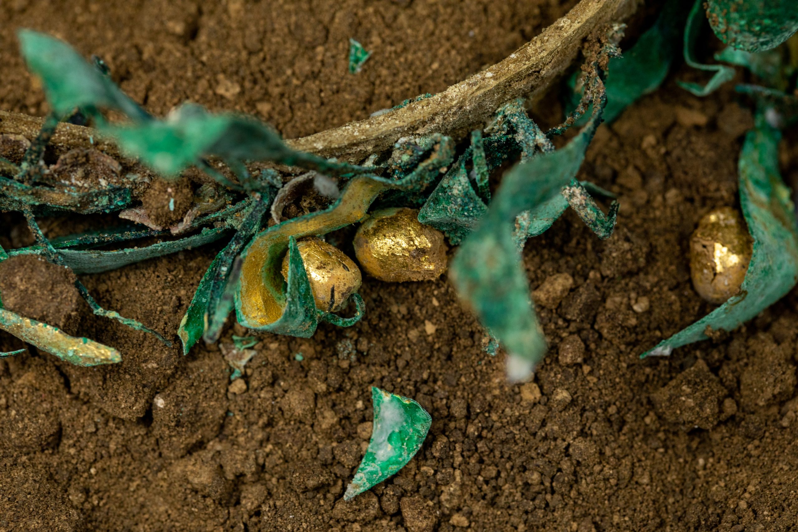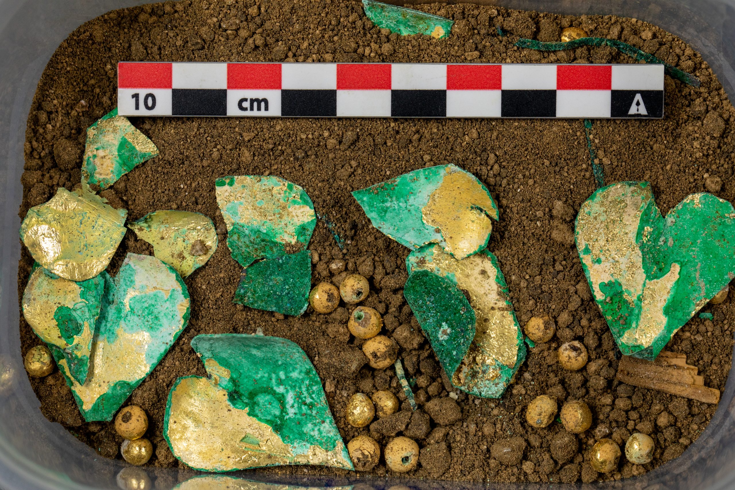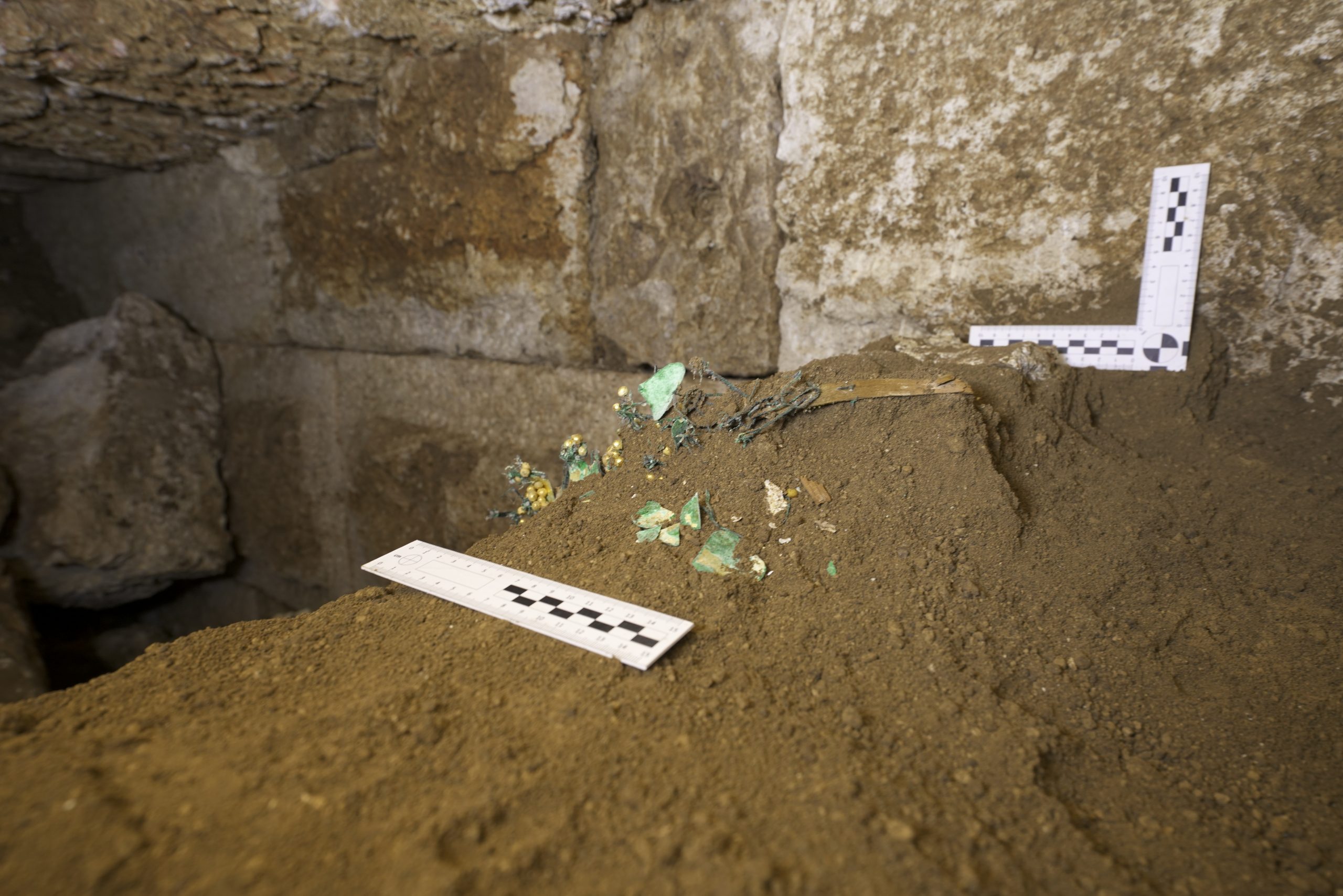 Aceste artefacte datate în secolul al III-lea d.Hr., împreună cu numeroase fragmente de lemn antic, unele păstrând încă urmele unor pigmenți, dar și oase umane și ceramică, au fost identificate într-o movilă funerară care a conținut un cavou din piatră prelucrată acoperit cu boltă semicilindrică.