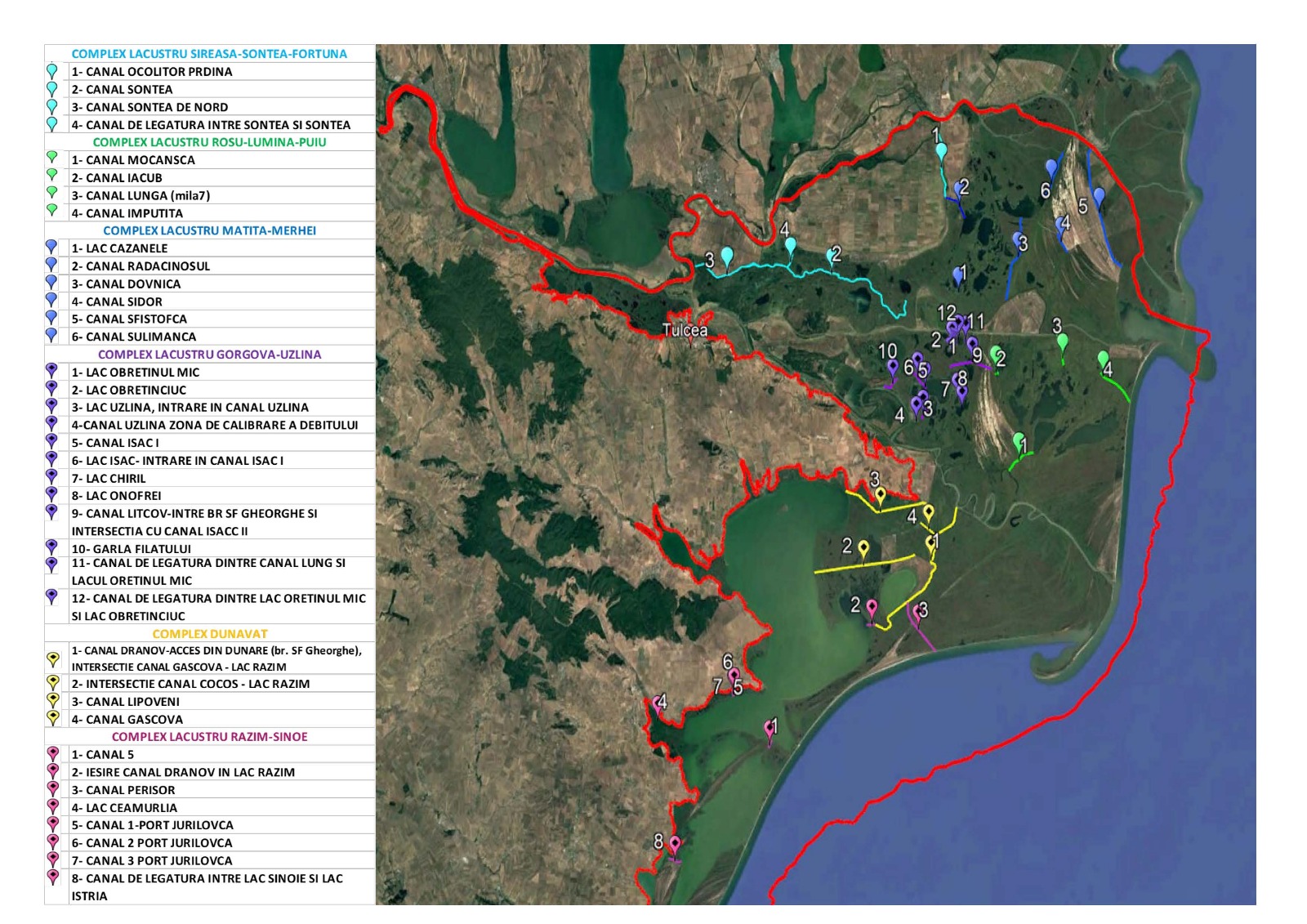 • Complex Razim-Sinoe: canalul 5 de la jumătatea canalului spre lac Sinoe; Ieșirea canalului Dranov în lacul Razim – nivelul apei este scăzut (se văd digurile de protecție din piatră ale canalului); canal Perișor; lacul Ceamurlia; canalele 1,2 și 3 care fac legătura între port Jurilovca și lacul Golovița; canal de legătură între lacul Sinoe și lacul Istria.