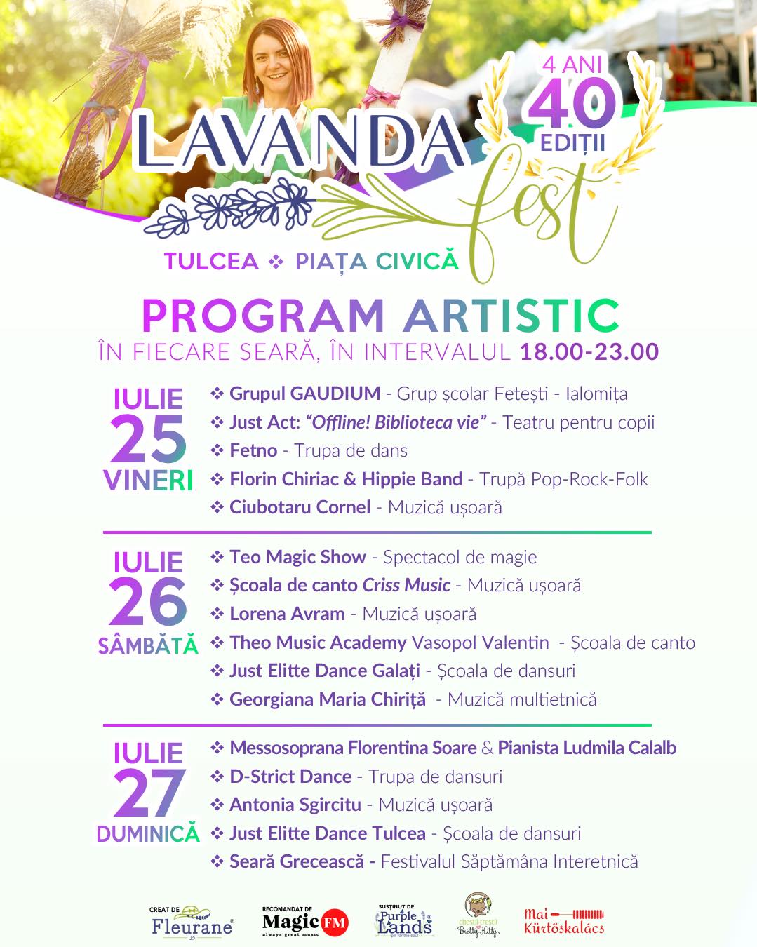 Ediția aniversară cu numărul #40 Lavanda Fest va avea loc pentru prima dată în Piața Civică din Tulcea, în perioada 25-27 iulie. Producători de lavandă și alți artizani din domenii diverse vor veni din toată țara, din orașe precum: Arad, Iași, Vrancea, Brașov, București, Timișoara, Cluj, Sibiu, Brăila, Galați, Giurgiu, Pitești, Constanța sau Bacău și se vor aduna într-un singur loc: Piața Civică din Tulcea!