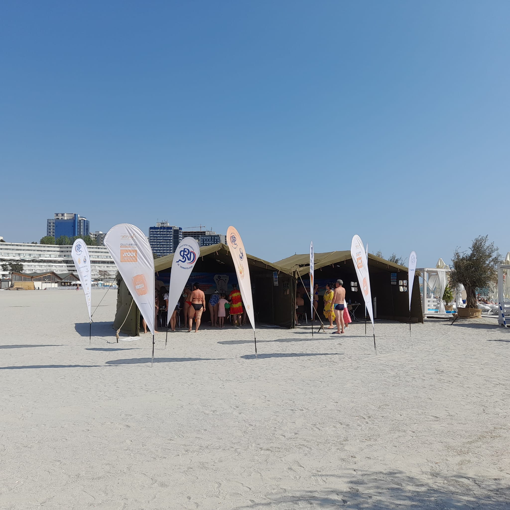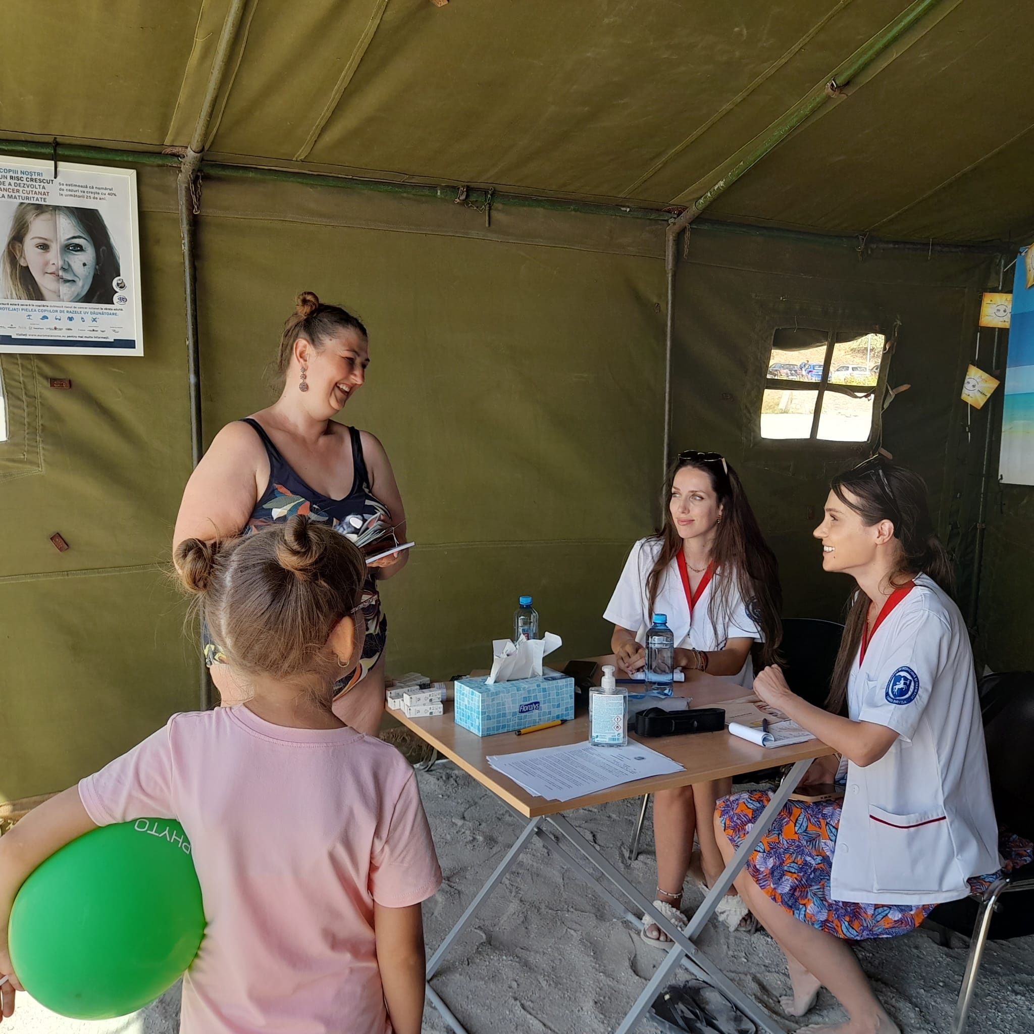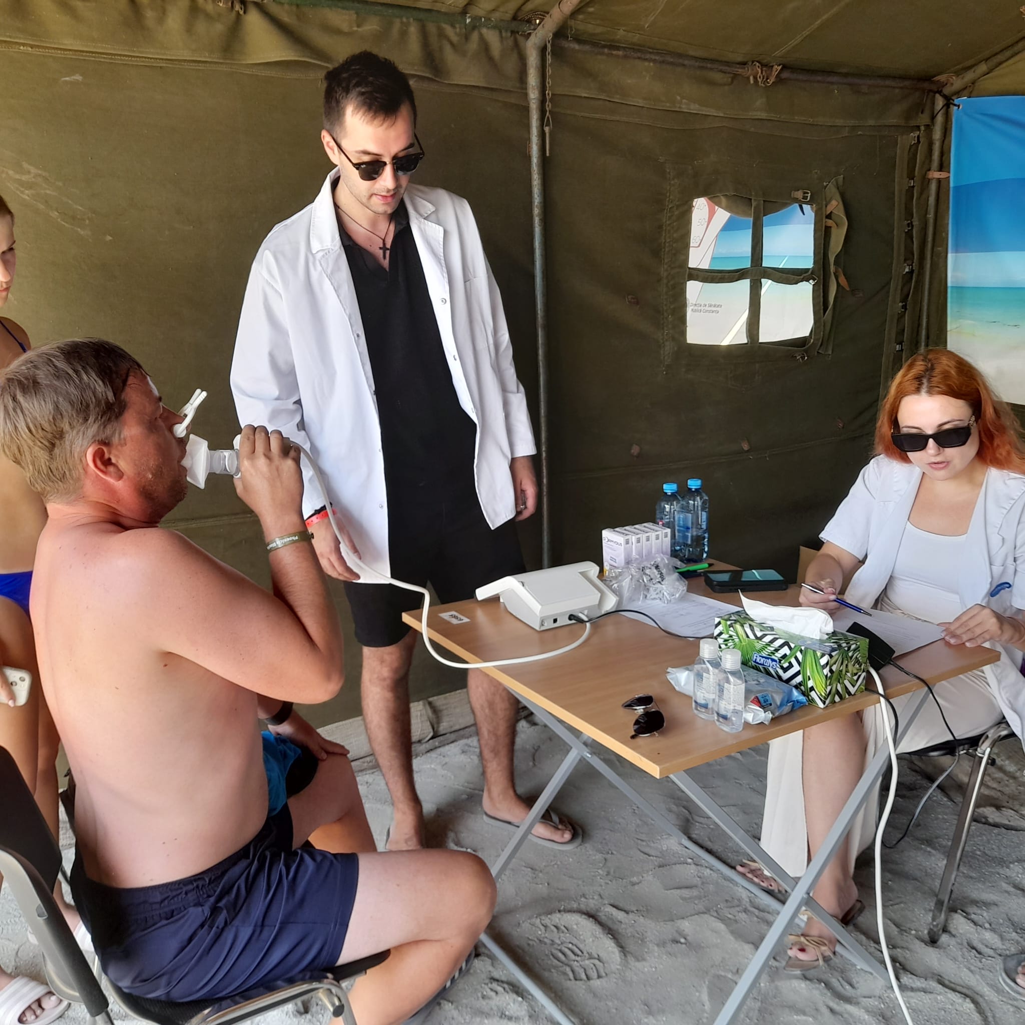 Pe plaja din Olimp, la fel ca în cele din Mangalia, Saturn, Neptun și Jupiter, corturi mari de armată sunt transformate în cabinete de pediatrie, pneumologie, endocrinologie și dermatologie. Într-unul dintre corturi, un medic rezident cântărește și măsoară înălțimea unei fetițe, alături un alt doctor tânăr îi explică unui bărbat cum se face o spirometrie. Uneori se formează cozi, în special acolo unde dermatologii oferă consultații, dar oamenii sunt interesați și de sfaturile endocrinologilor. Turiștii sunt încântați că pot beneficia de evaluări fără programare și fără costuri. “Este o acțiune minunată și benefică. Dacă vrei să mergi la un specialist, trebuie să duci la medicul de familie să iei bilet de trimitere, cu bilet de trimitere trebuie să aștepți până îți vine rândul. Așa e foarte bine”, ne-a spus o turistă din Brașov, care a trecut pe la toate cabinetele, împreună cu fiica sa. “E un lucru bun. Poți să beneficiezi de un consult la care, în mod normal, nu te-ai duce”, ne-a mărturisit un turist din București, care își aștepta rândul la o examinare dermatologică. “O chestie de aici poate merge mai departe. Dacă ți se semnalează ceva grav, te poți duce mai departe să îți faci investigații la tine acasă sau unde știi tu mai bine”, ne-a declarat o altă turistă din județul Brașov.
