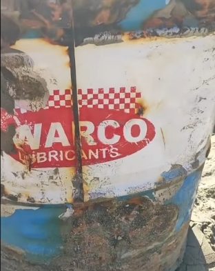 Recipientele poartă inscripția Warco Lubricants, un producător american de uleiuri și fluide tehnice destinate industriei auto și echipamentelor industriale.