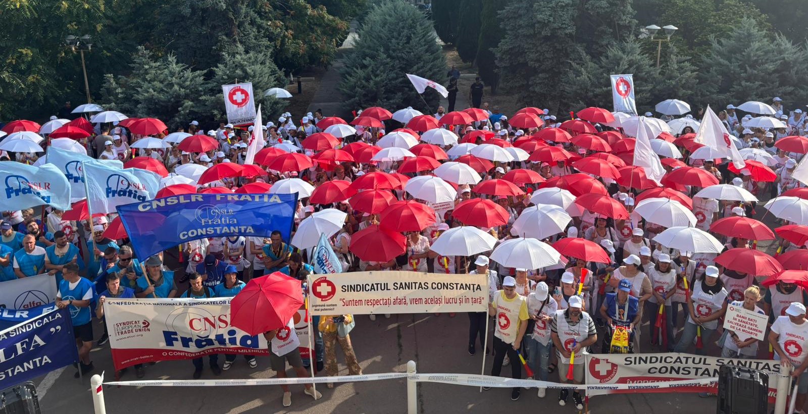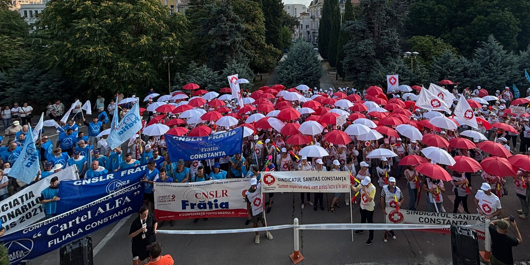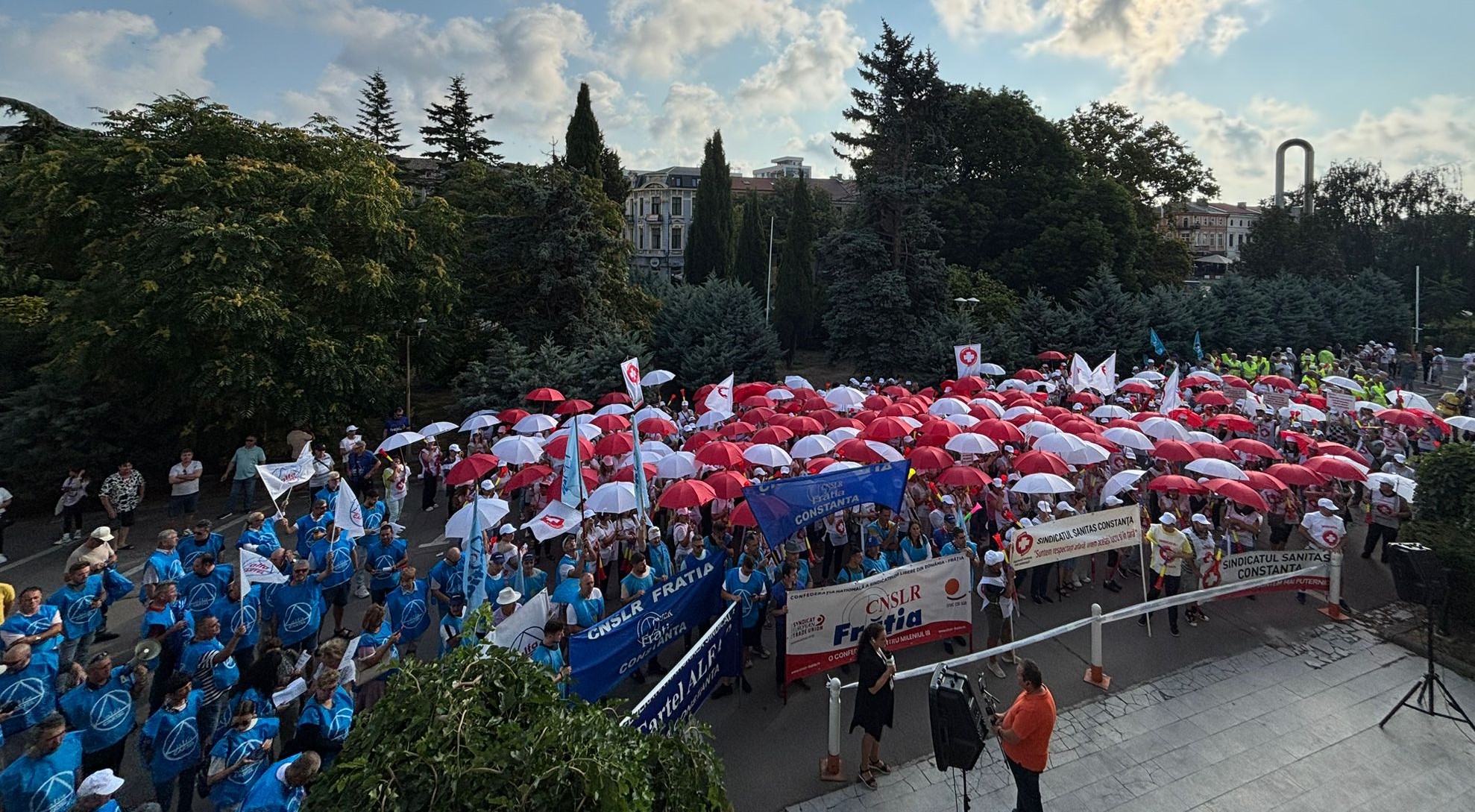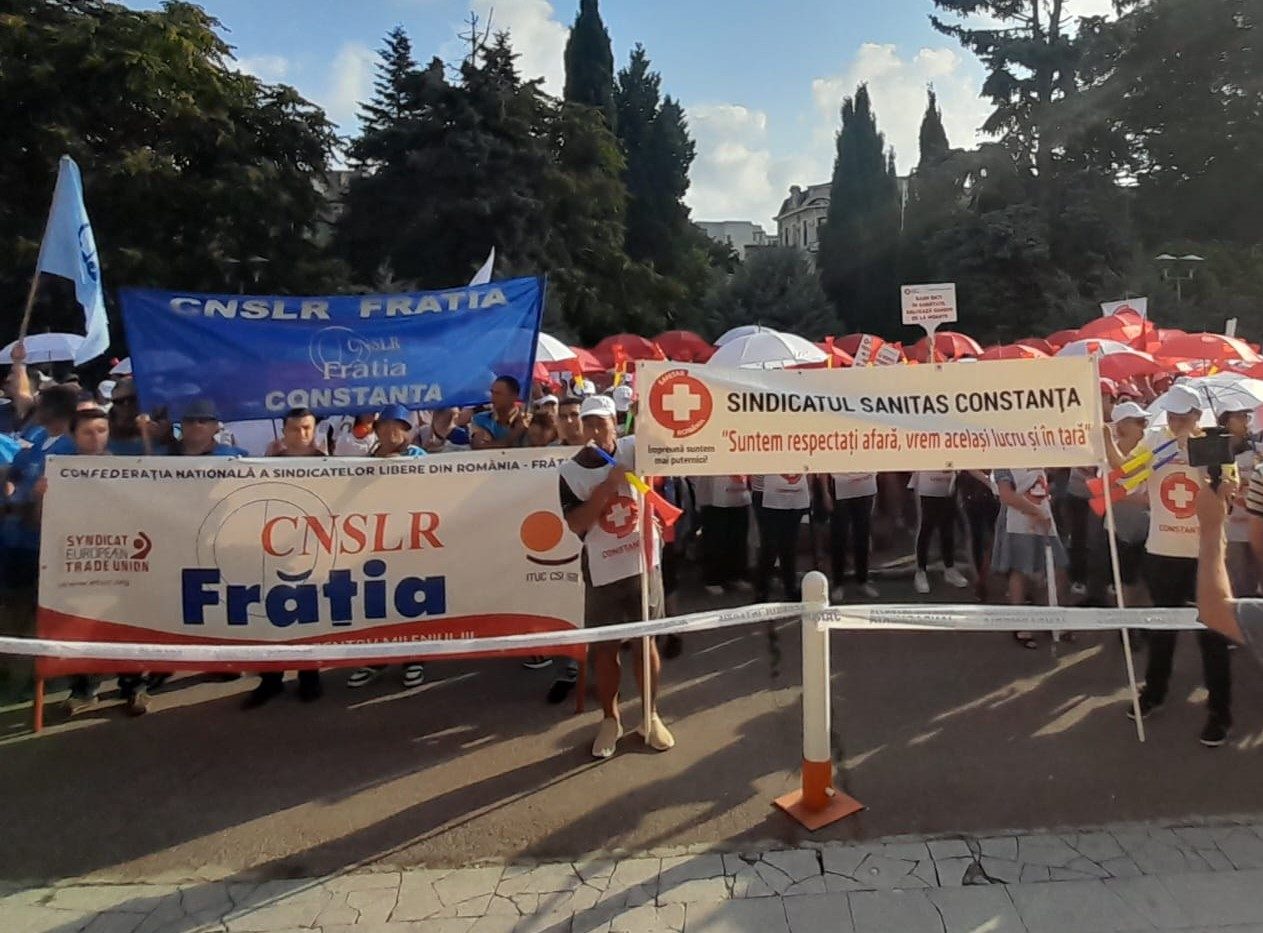 Sute de sindicaliști din patru mari confederații – CNSLR Frăția, Cartel Alfa, Confederația Sindicatelor Democratice din România și Confederația Sindicatelor Naționale Meridian – au protestat, miercuri, în fața Prefecturii Constanța.