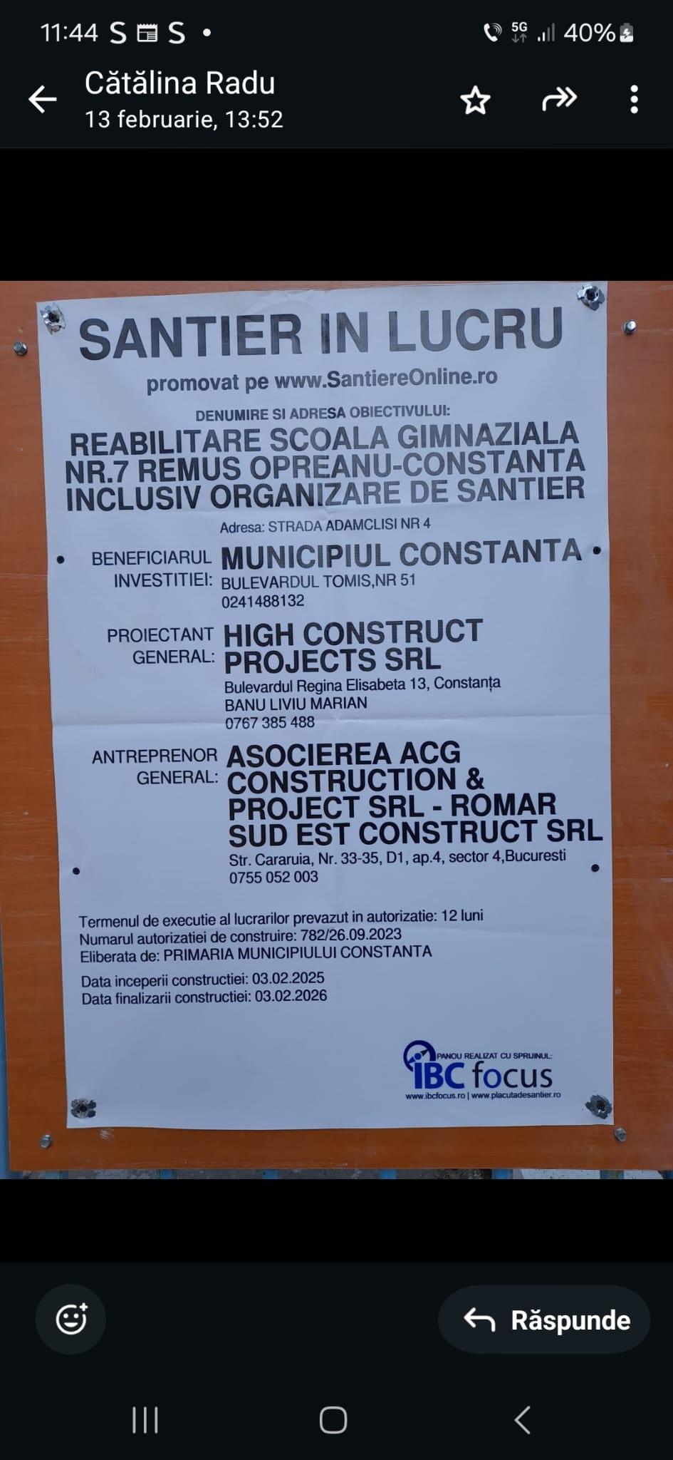 • Elevii de clasa a 8-a, care în iunie au Evaluarea Naţională,  cum pot învață fără uși și în zgomote de bormașini?  Profesorii cum se pot face auziți când bormașinile se aud fix când elevii de clasa a 8-a au ore? Anul trecut s-au chinuit la Energetic, au alergat în 5 minute de pauză de la o clasa la altă, de la un etaj la altul, zilnic! Anul acesta au stat 3 săptămâni acasă,  sub pretexte de Săptămâna Verde, Altfel. Etc. Cum să compari vreodată copiii de la Liceul  Ovidius ( de exemplu) care fac orele începând cu 9.09  cu ai noștri care se chinuie în săli neterminate, online, și alte improvizații! De ce nu au fost relocați dacă termenul de execuție este în 2026? Adevăratul este că sunteți depășiti de situație și aruncați mâța de la unii la alții! Primăria Constanța, recunoașteți că sunteți depășiti de situație și faceți ceva constructiv pentru elevii școlii nr.7!  Când vor recupera materia pe care ar trebui să o parcurgă în condiții decente?