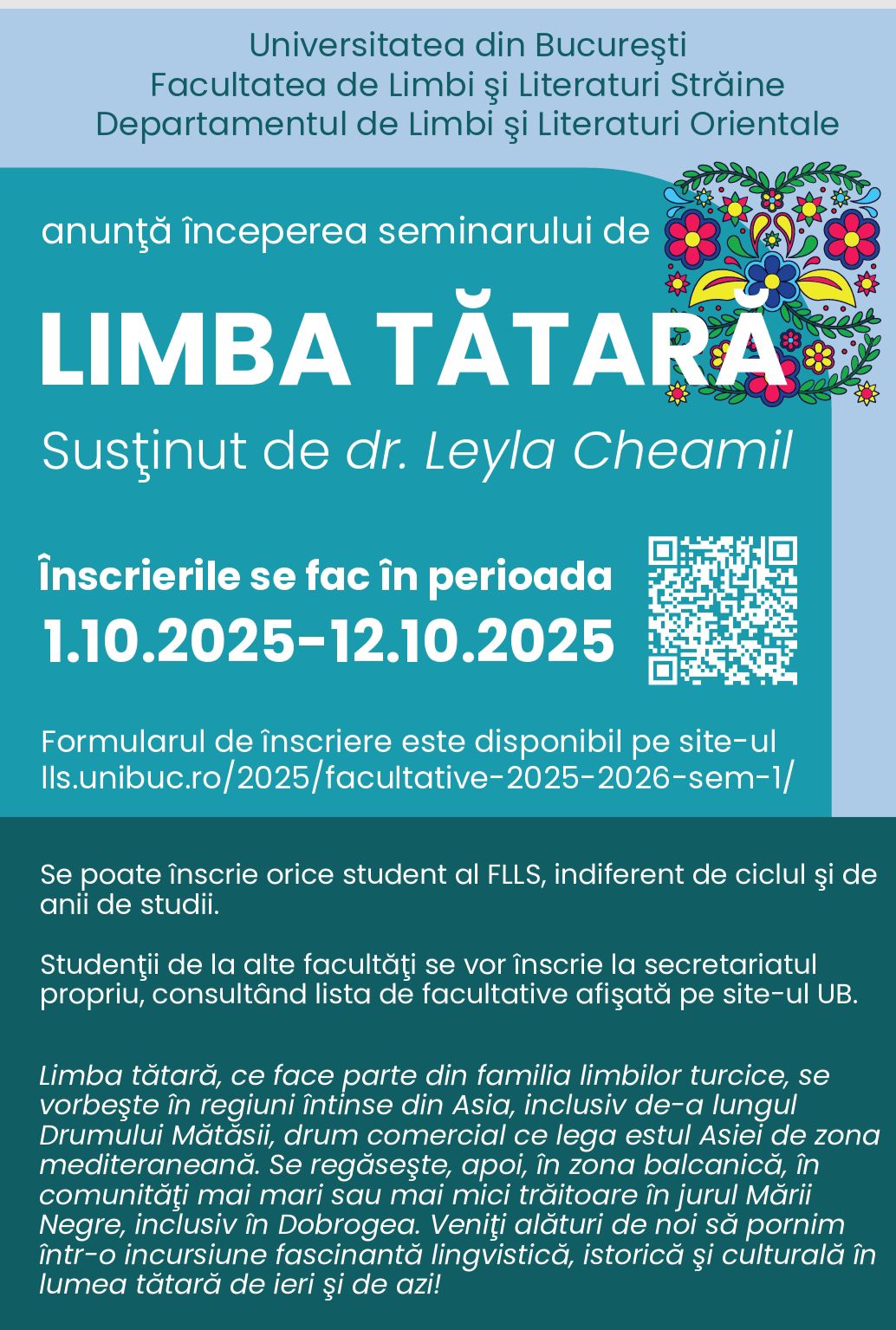 Din acest semestru, se predă limba tătară, în cadrul masteratului „Spațiul islamic societăți culturi, mentalități”, curs deschis tuturor (nu numai masteranzilor). Seminarul va fi susținut de Dr. Leyla Cheamil, ce are tătara ca limbă maternă, vă așteaptă pentru a vă dezvălui cât mai multe din aspectele limbii și culturii tătare. Veți putea folosi tătara nu numai în Dobrogea, ci pe o arie largă ce cuprinde regiuni din Europa si Asia. În primul semestru al acestui an universitar înscrierea are loc în intervalul 1 – 12 octombrie.