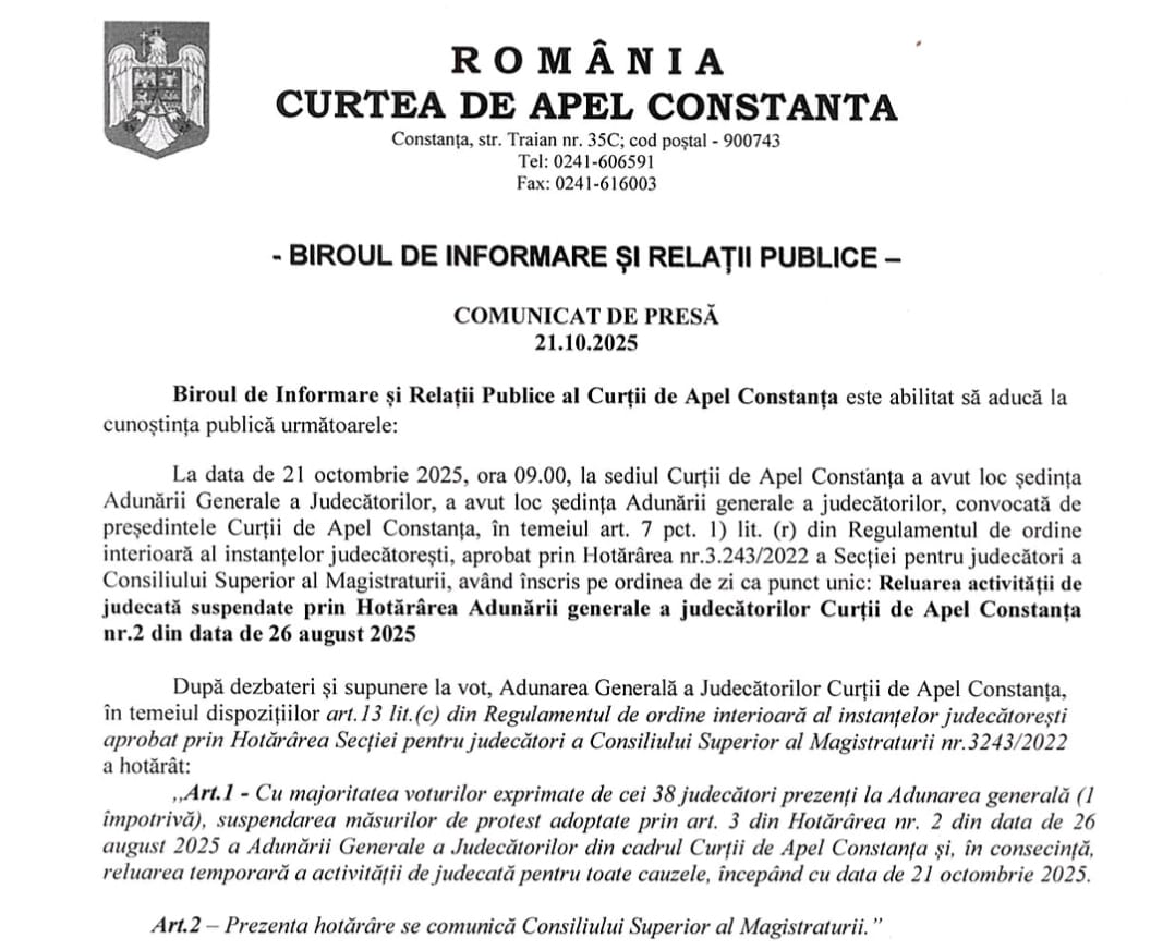 ‘În urma Adunării Generale a judecătorilor din cadrul Curții de Apel București din data de 21.10.2025, a fost adoptata Hotărârea nr. 4, prin care s-a hotărât suspendarea protestului și reluarea activității de judecată începând cu data de 23.10.2025’, a anunțat CAB.