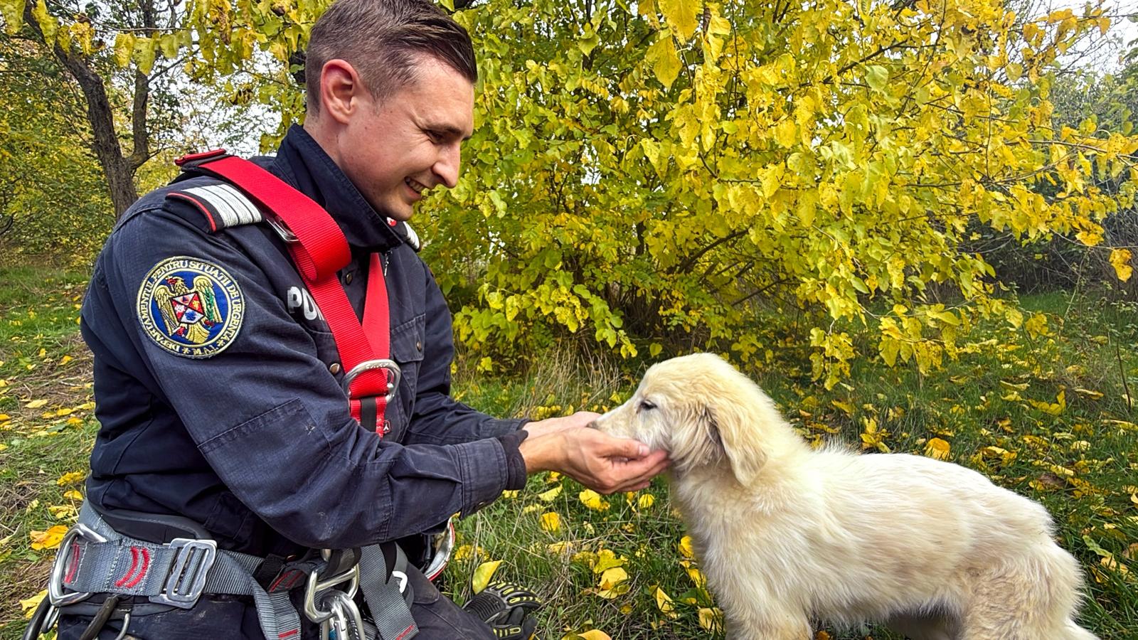 FOTO/VIDEO: Pompierii tulceni au salvat o cățelușă care căzuse într-o fântănă dezafectată, adâncă de aproximativ 15 metri