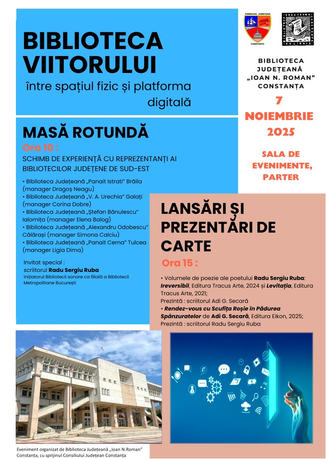 Începând cu ora 15.00, în Sala de Evenimente a bibliotecii, vor avea loc lansări și prezentări de carte ale scriitorilor Radu Sergiu Ruba („Ireversibil”, Editura Tracus Arte, 2024 și „Levitația”, Editura Tracus Arte, 2021) și Adi G. Secară („Rendez-vous cu Scufița Roșie în Pădurea Spânzuratelor”, Editura Eikon, 2025). Eveniment organizat de Biblioteca Județeană „Ioan N. Roman” cu sprijinul Consiliului Județean Constanța.