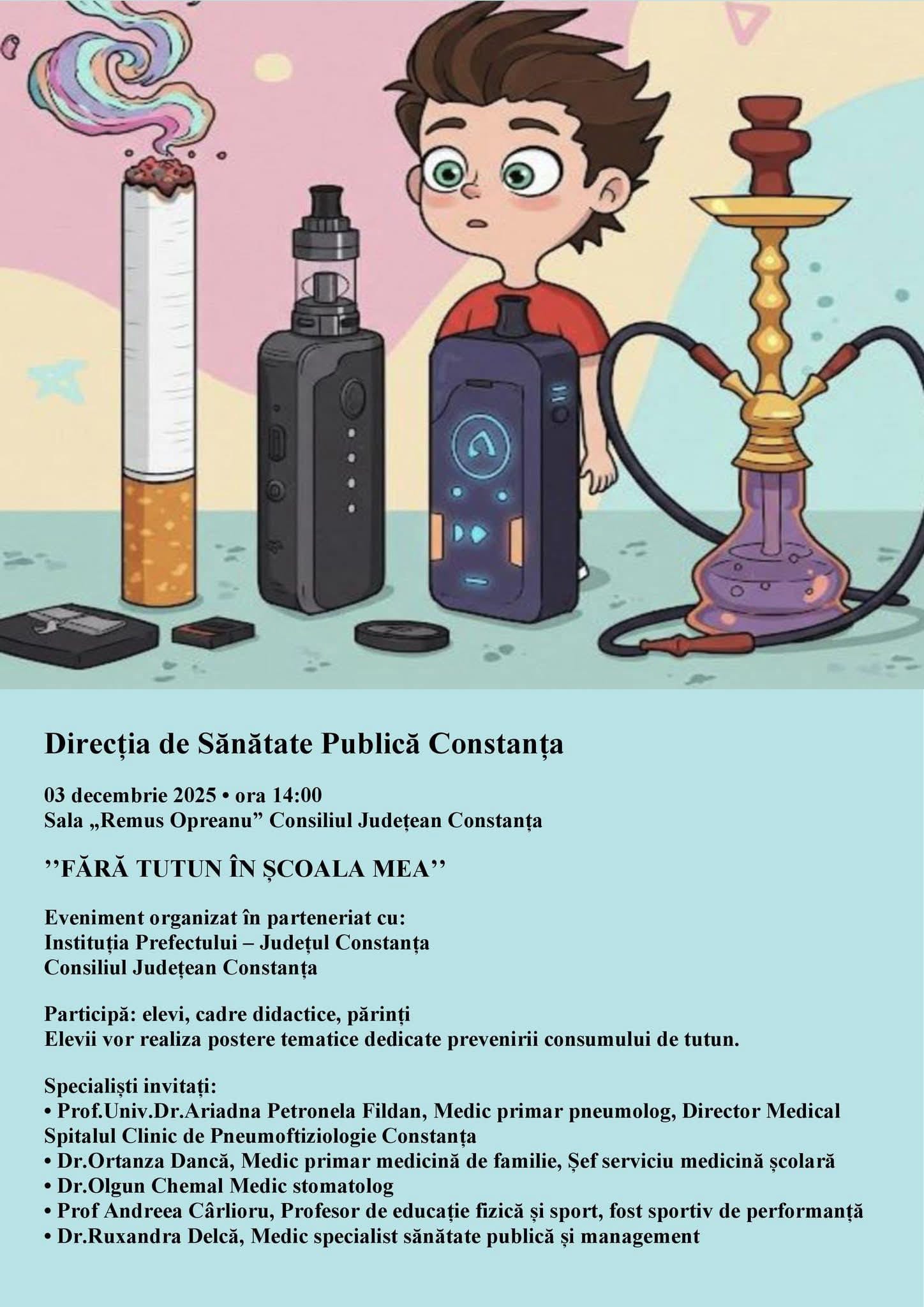 “Evenimentul va avea loc în sala “Remus Opreanu” a Consiliului Județean Constanța și își propune să promoveze un mediu școlar fără tutun, în care copiii, dar și adulții să fie încurajați să adopte un stil de viață sănătos și responsabil. Participanții vor avea ocazia să ia parte la activități educative, iar copiii vor realiza desene și postere tematice care să ilustreze pericolele consumului de tutun și importanța alegerilor sănătoase. Aceste lucrări vor fi expuse în cadrul evenimentului ca parte a unui demers vizual de informare și implicare comunitară”, a declarat dr. Ruxandra Delcă, de la DSP Constanța.