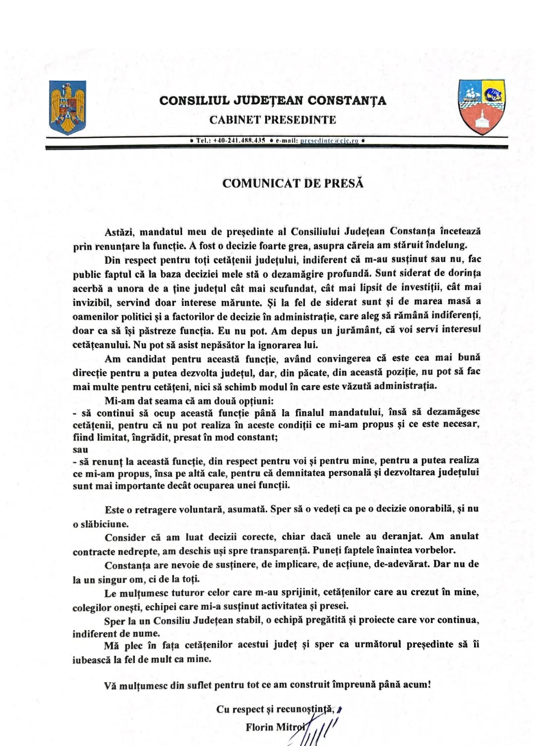 Președintele Consiliului Județean Constanța, liberalul Florin Mitroi, și-a dat, astazi, demisia. Într-un comunicat de presă, Mitroi a precizat că la baza deciziei stă o dezamăgire profundă. “Sunt siderat de dorinţa acerbă a unora de a ține județul cât mai scufundat, cât mai lipsit de investiții, cât mai invizibil, servind doar interese mărunte. Şi la fel de siderat sunt şi de marea masă a oamenilor politici şi a factorilor de decizie în administrație, care aleg să rămână indiferenți, doar ca să își păstreze funcția. Eu nu pot. Am depus un jurământ, că voi servi interesul cetățeanului. Nu pot să asist nepăsător la ignorarea lui”, a subliniat Mitroi.