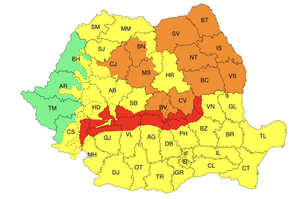 De asemenea, până luni, la ora 2:00, va fi Cod portocaliu de viscol puternic și vizibilitate foarte redusă în cea mai mare parte a Moldovei și local în Transilvania.